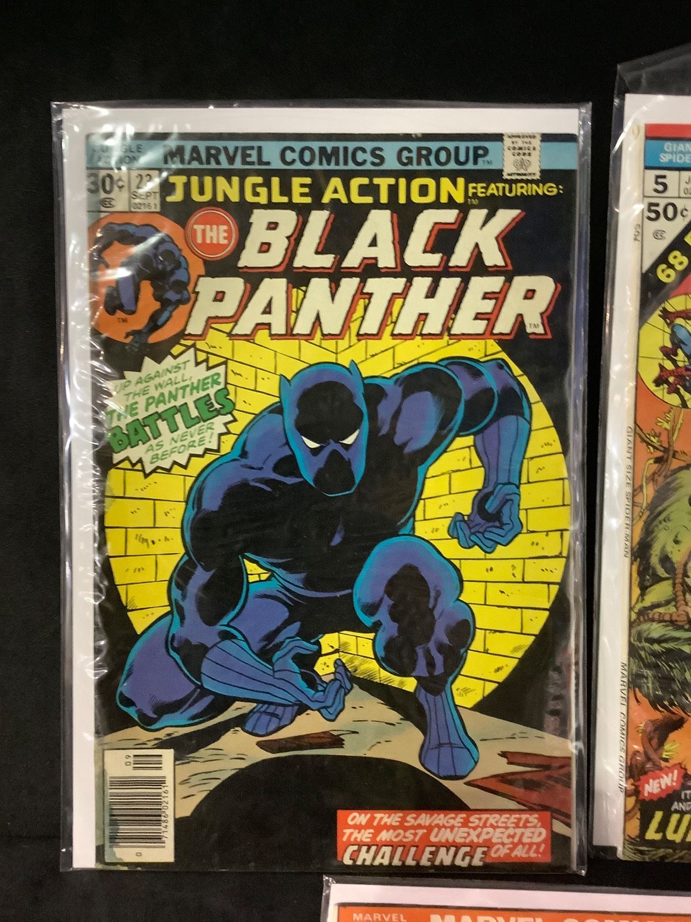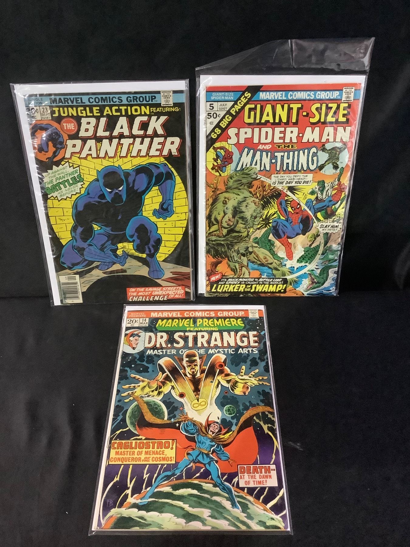 3 MARVEL COMIC BOOKS: GIANT-SIZE SPIDER-MAN AND THE MAN-THING #5, JUNGLE ACTION THE BLACK PANTHER #23, & MARVEL PREMIER DR. STRANGE #14