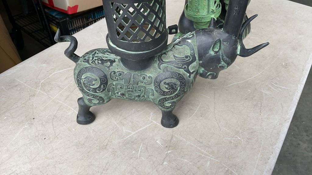 3 METAL EASTERN LANTERN FIGURES - BULL AND 2 MEN