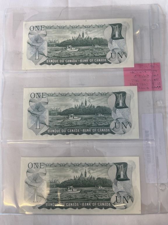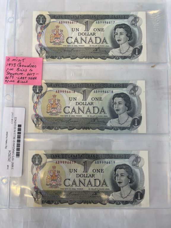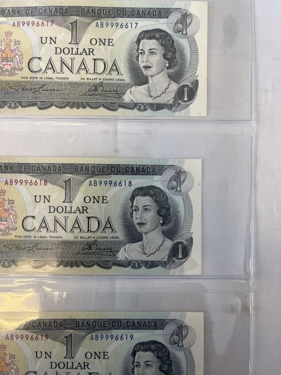 3 MINT 1973 CANADIAN $1 BILLS IN SEQUENCE 6617-6619 LAST ISSUE