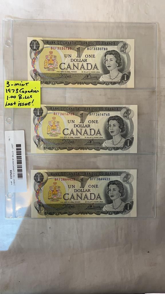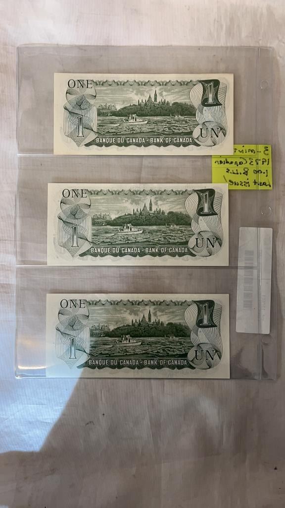 3 MINT 1973 CANADIAN $1 BILLS - LAST ISSUE