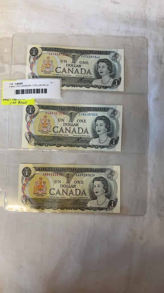 3 MINT 1973 CANADIAN 1 DOLLAR BILLS - LAST ISSUE OF BILL