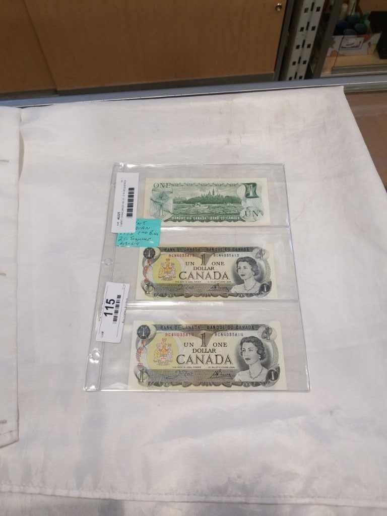 3 MINT CANADIAN 1973 $1 BILLS - 2 IN SEQUENCE 613,614