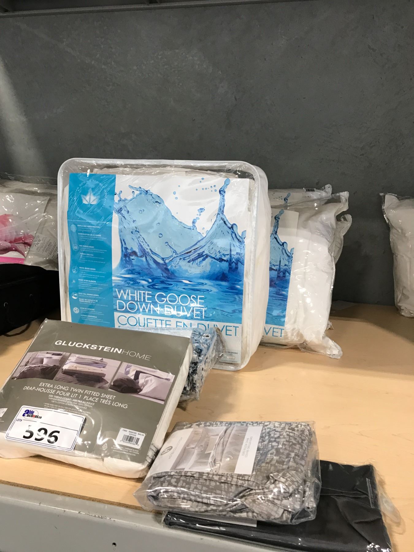 3 MISC. PILLOWS, WHITE GOOSE DOWN TWIN DUVET, TWIN FITTED SHEETS, EURO PILLOW SHAMS AND MORE