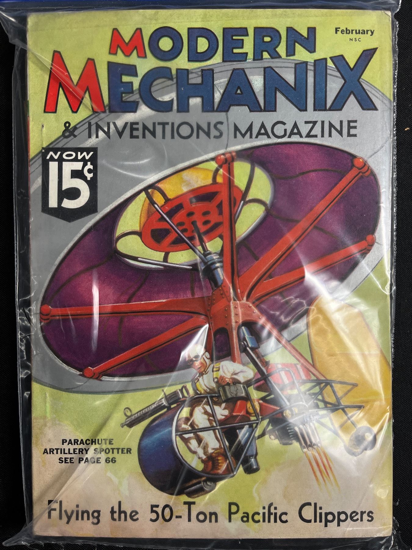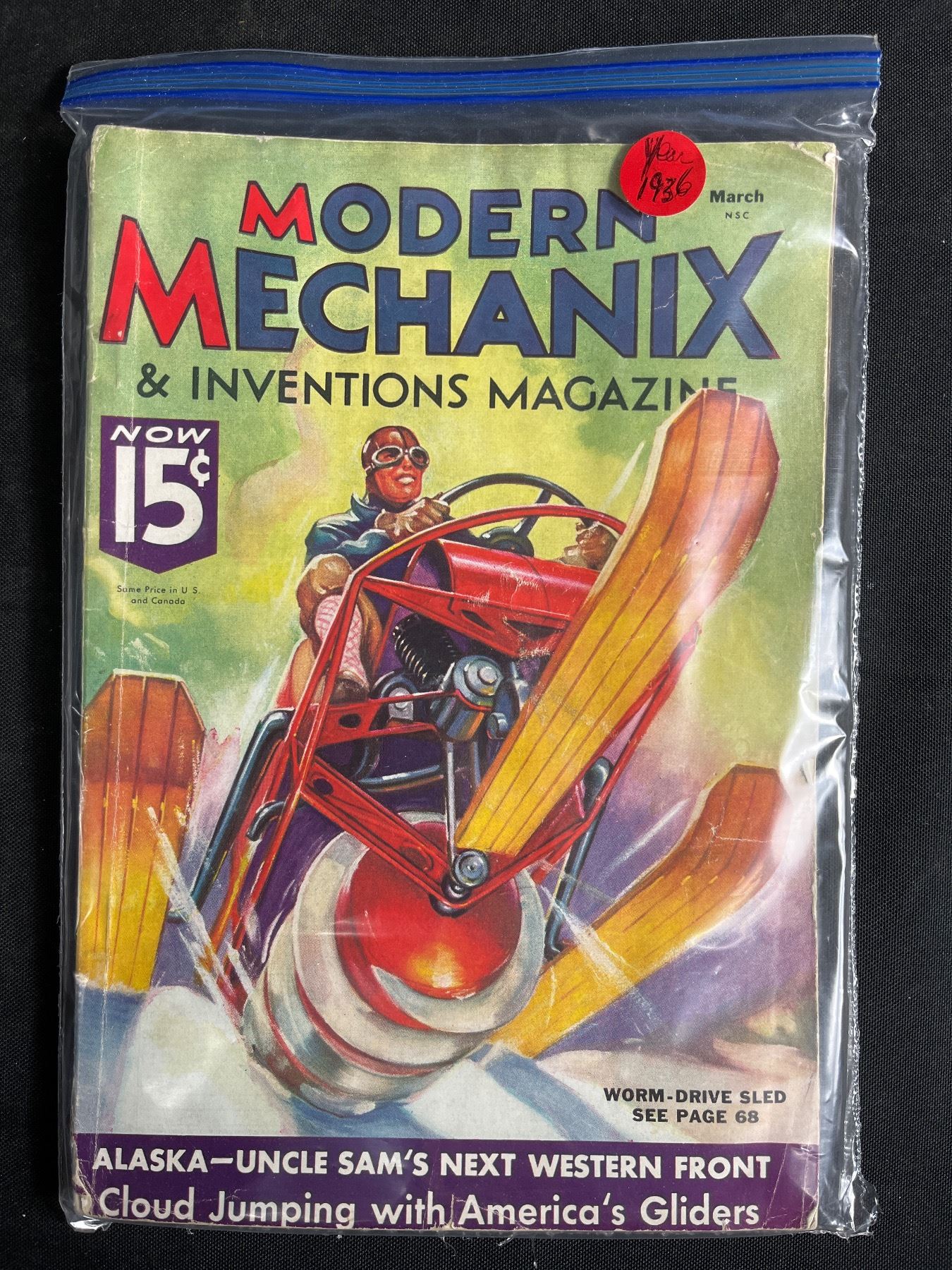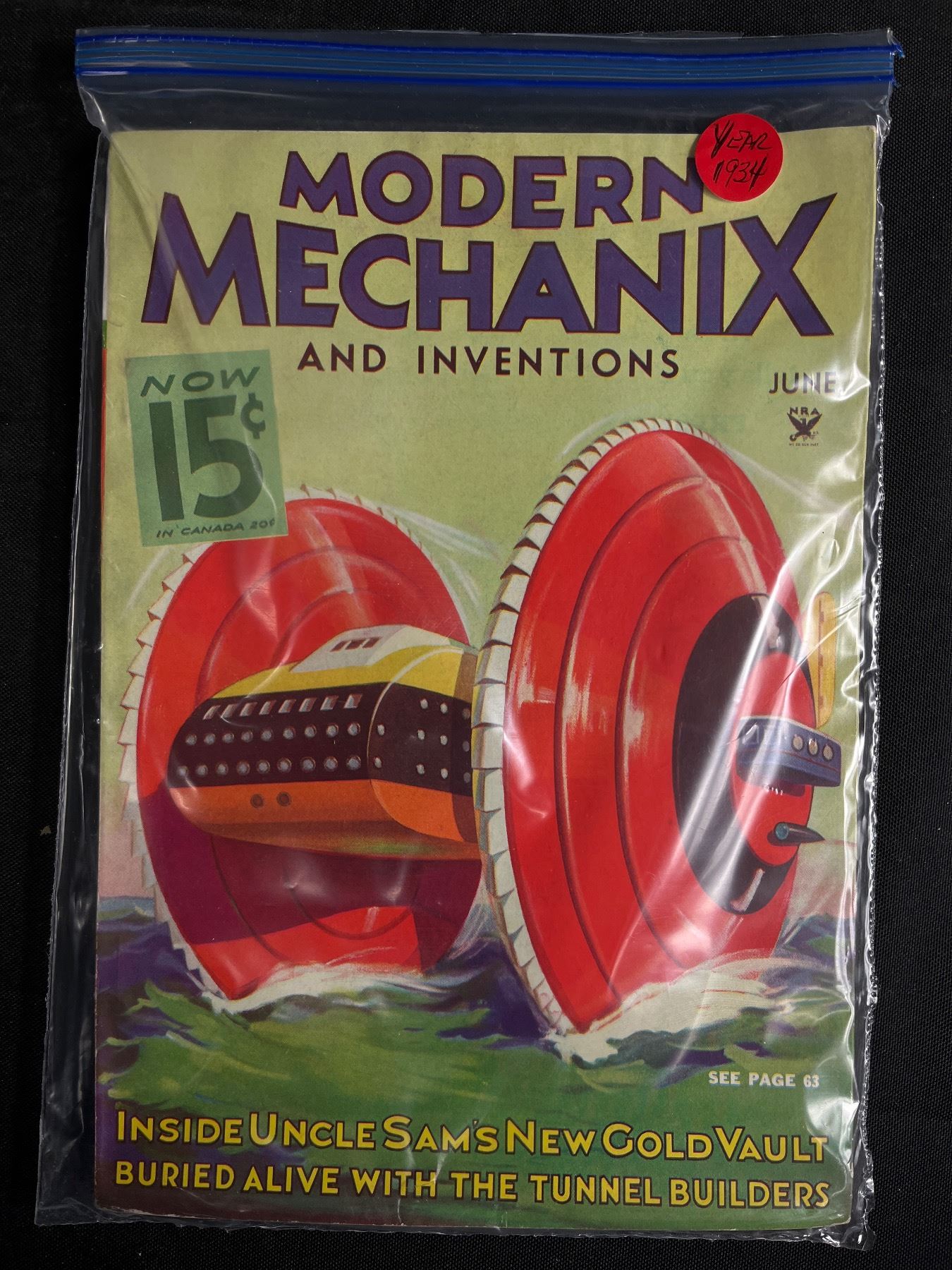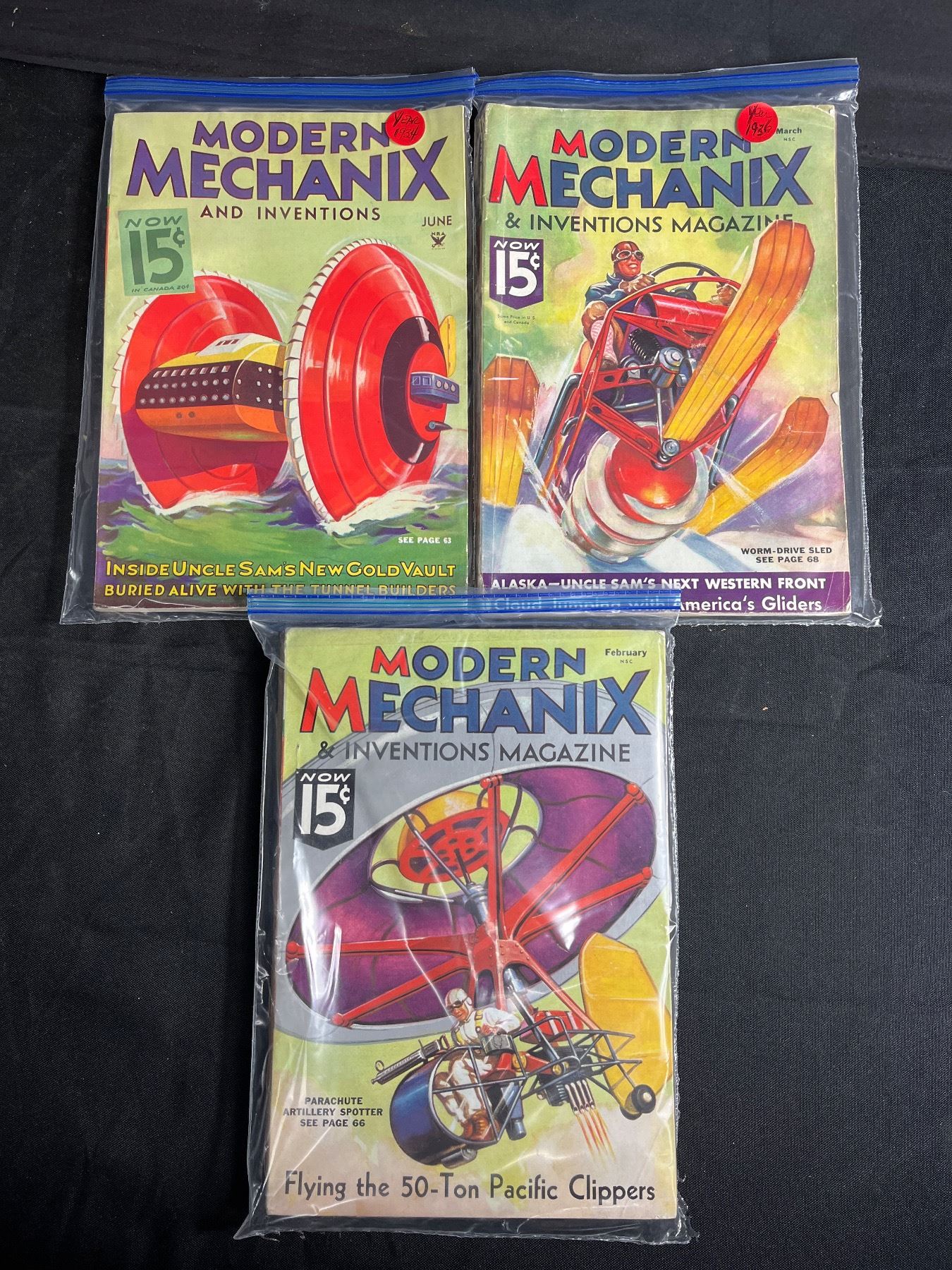 3 Modern Mechanix And Inventions Magazines In Bag On Board - June 1934, February 1936 & March 1936