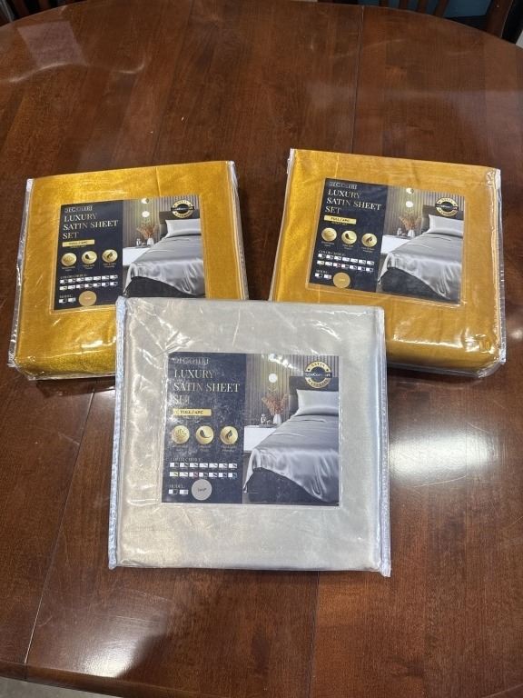 3 NEW FULL SIZE LUXURY SATIN 4PC SHEET SETS, 2 GOLD AND ONE TAUPE