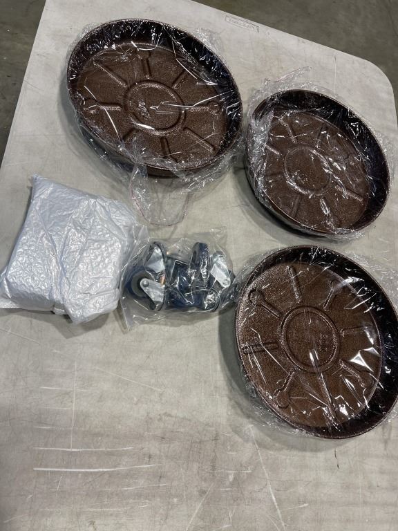 3 NEW HAMMERED COPPER LOOK 12 INCH ROUND ROLLING PLANTER POT DOLLYS