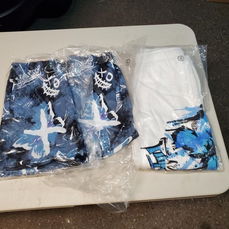 3 NEW PINK ABYSS CLOTHING 2 BLUE SHORTS (M) & (S) WAIST 28"- 38" & 30"-40" WITH SMALL SWEAT PANTS 28"-38"