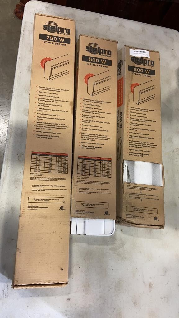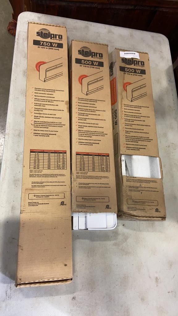 3 NEW STELPRO ELECTRIC BASEBOARD HEATERS, 2 ARE 500 WATT, ONE IS 750 WATT
