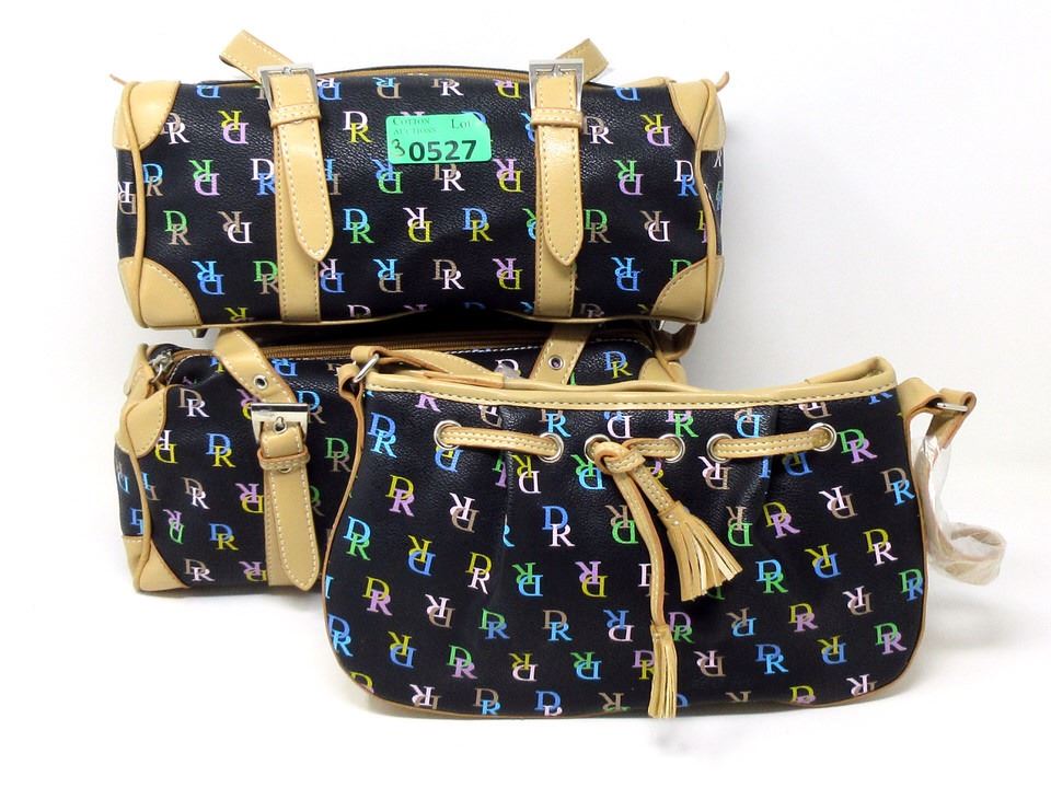 Small shoulder bag measures 3" x 6" x 10", and the 2 handbags measure 5" x 5" x 12".