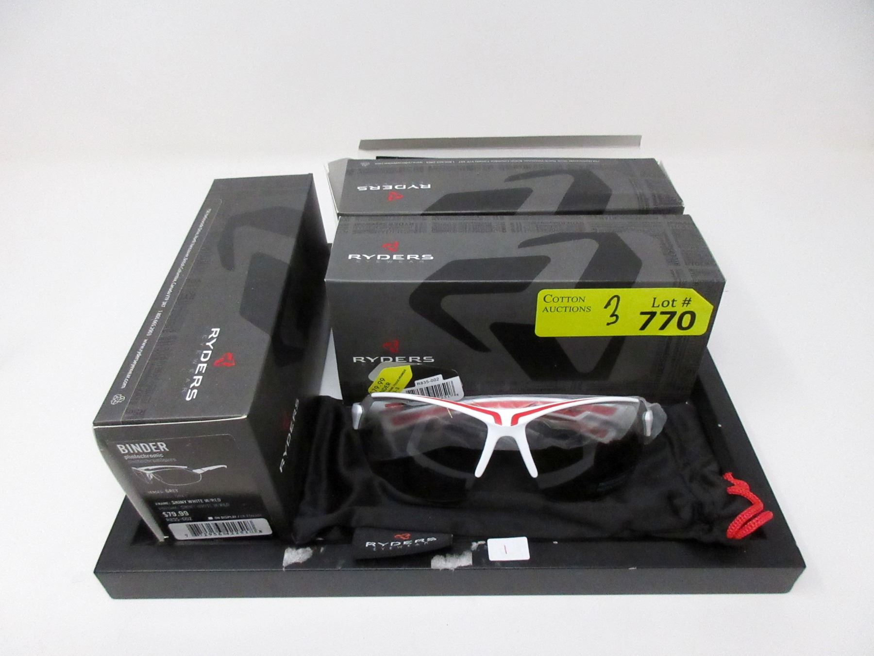 Grey Photochromic lenses with Shiny White with Red Frame. Retail: $79.99 each. Complete with box, attached price tag and soft bag.