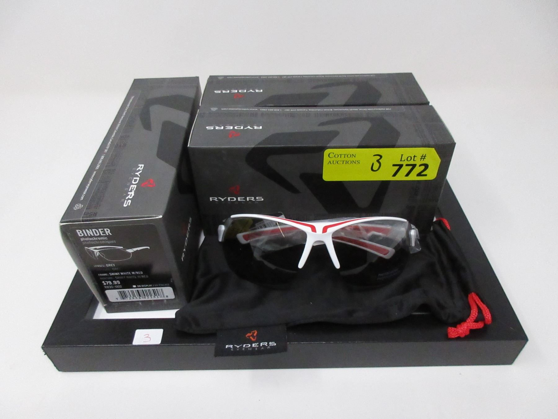 Grey Photochromic lenses with Shiny White with Red Frame. Retail: $79.99 each. Complete with box, attached price tag and soft bag.