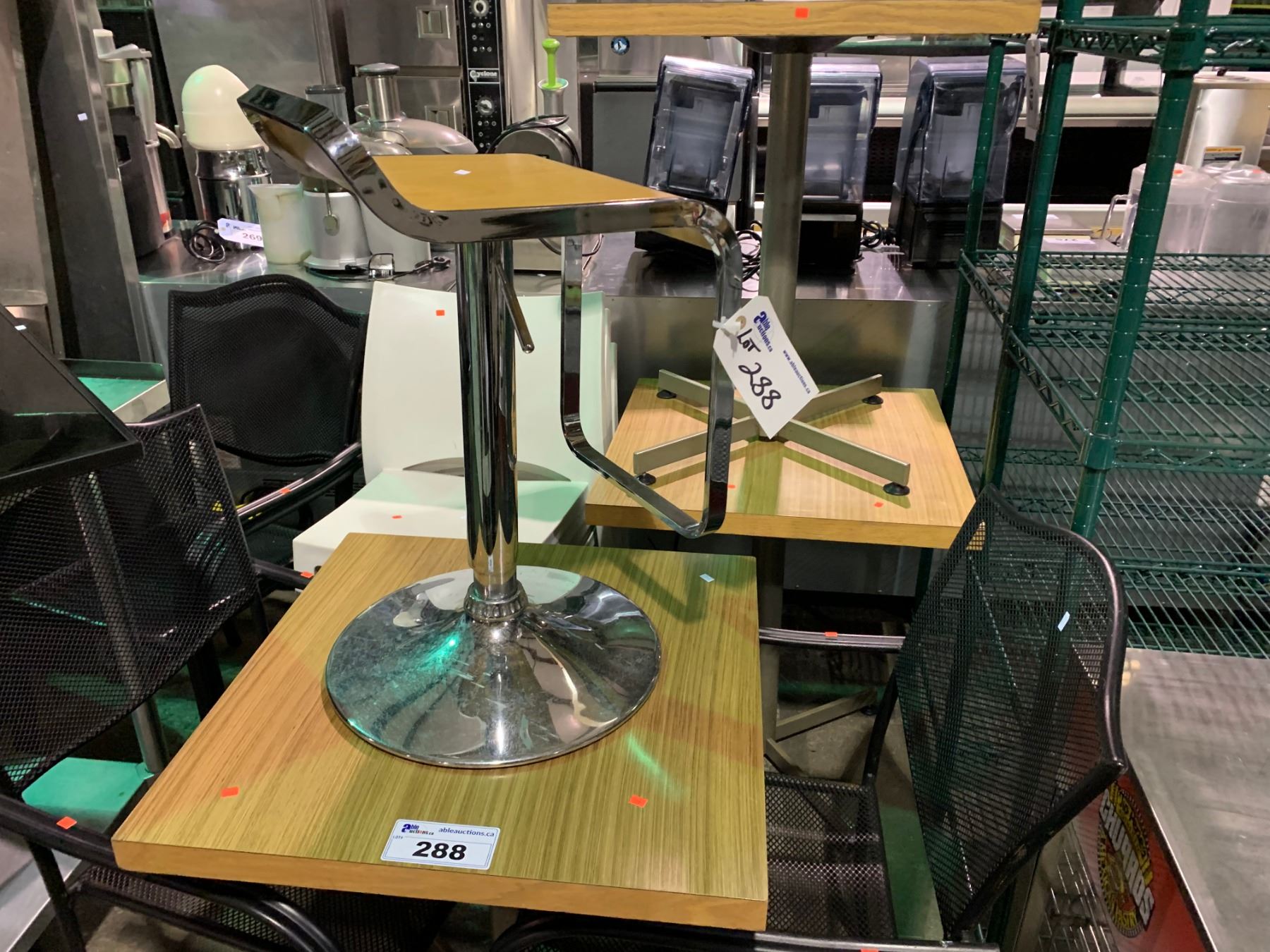 3 OAK CAFE TABLES, MAPLE GAS LIFT STOOL, 4 BLACK METAL STACKING ARM CHAIRS, & 5 WHITE PLASTIC STACKING CHAIRS