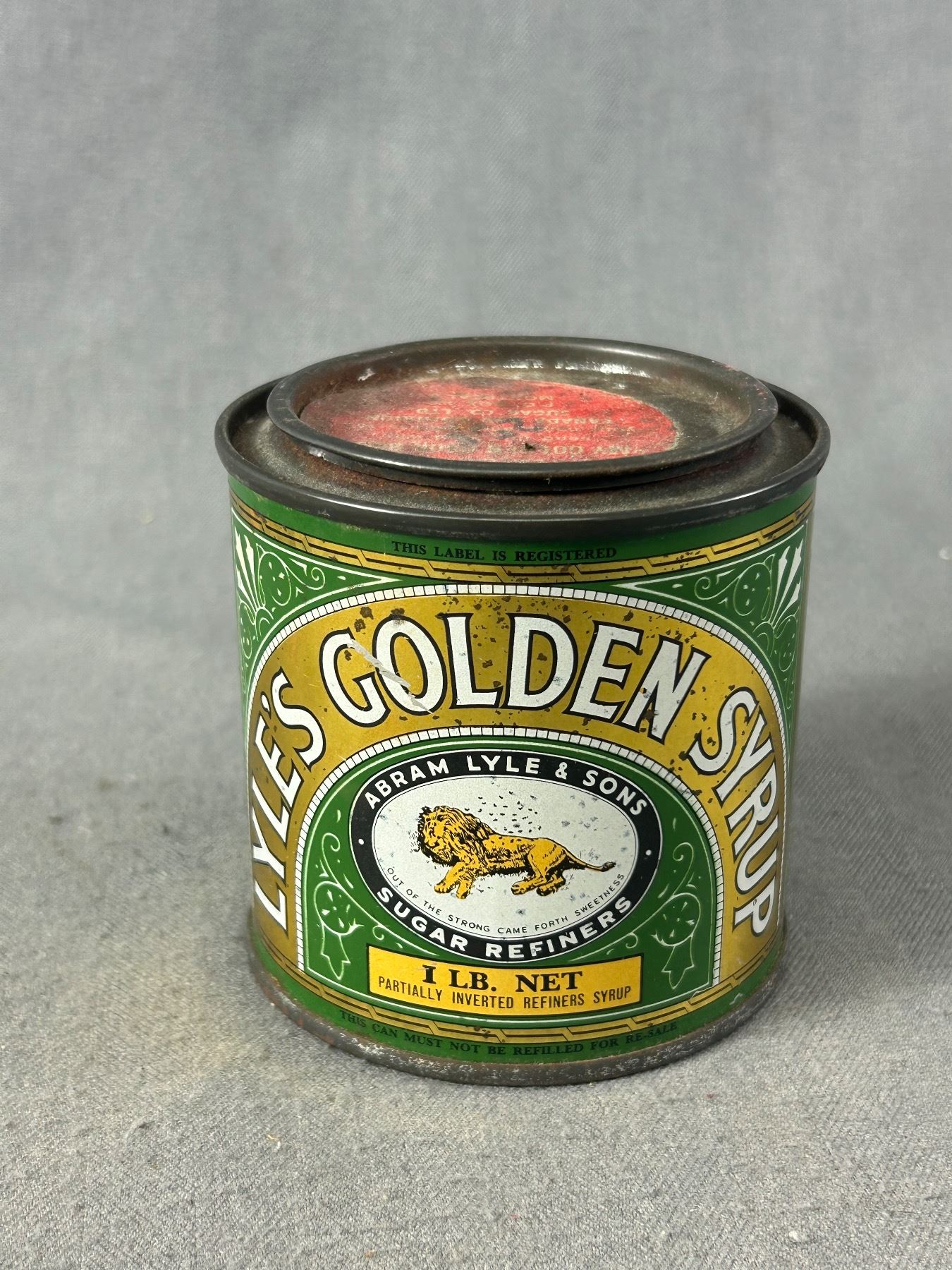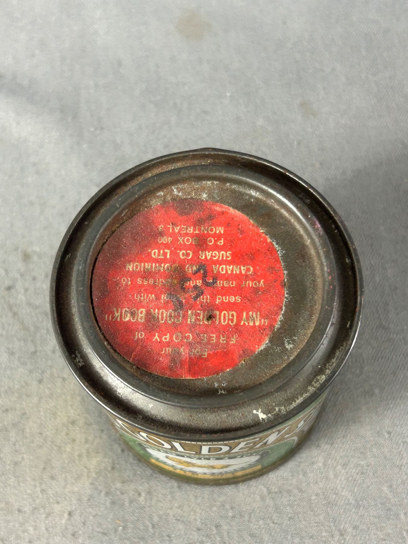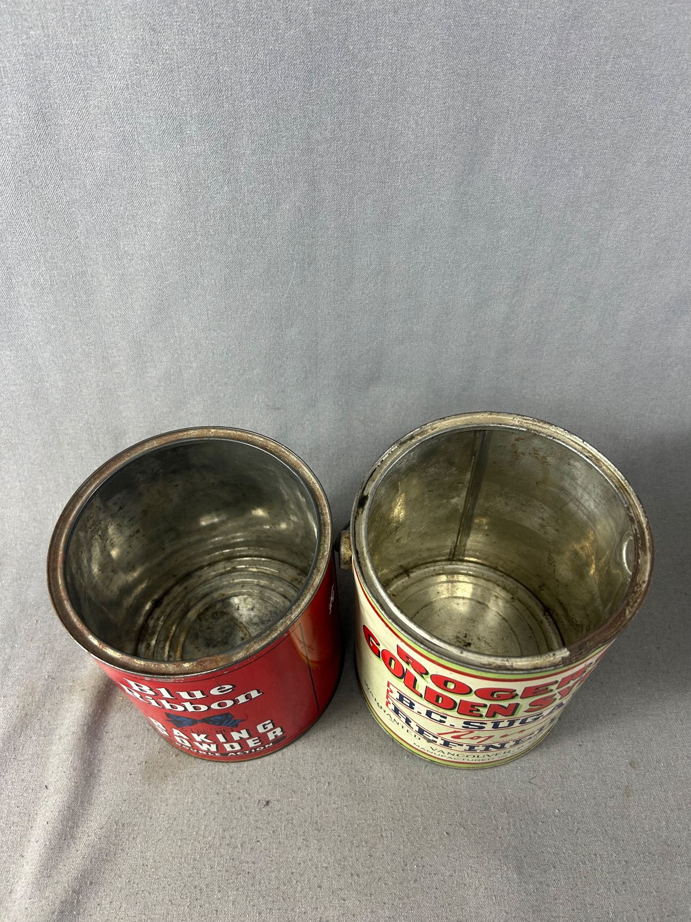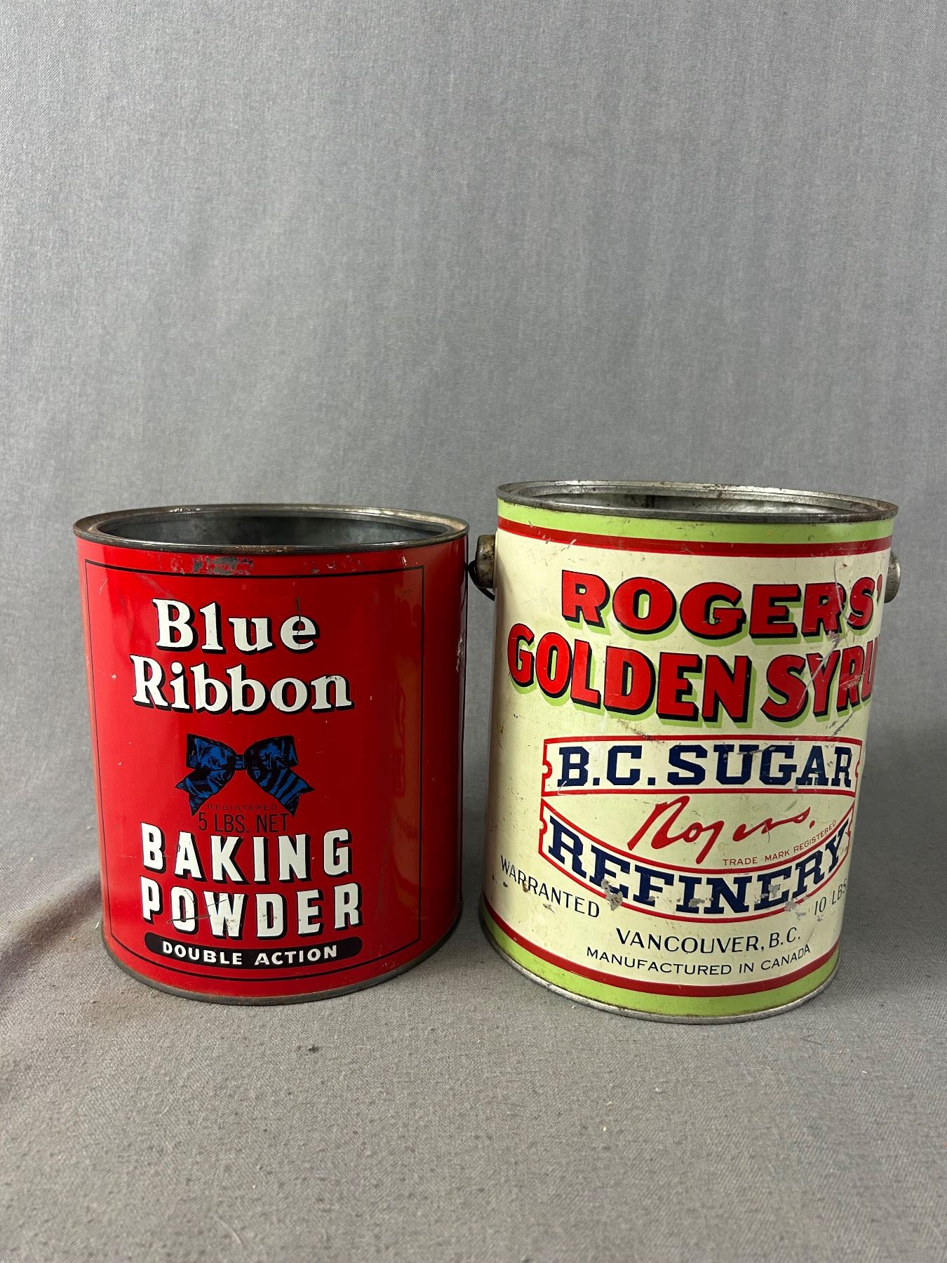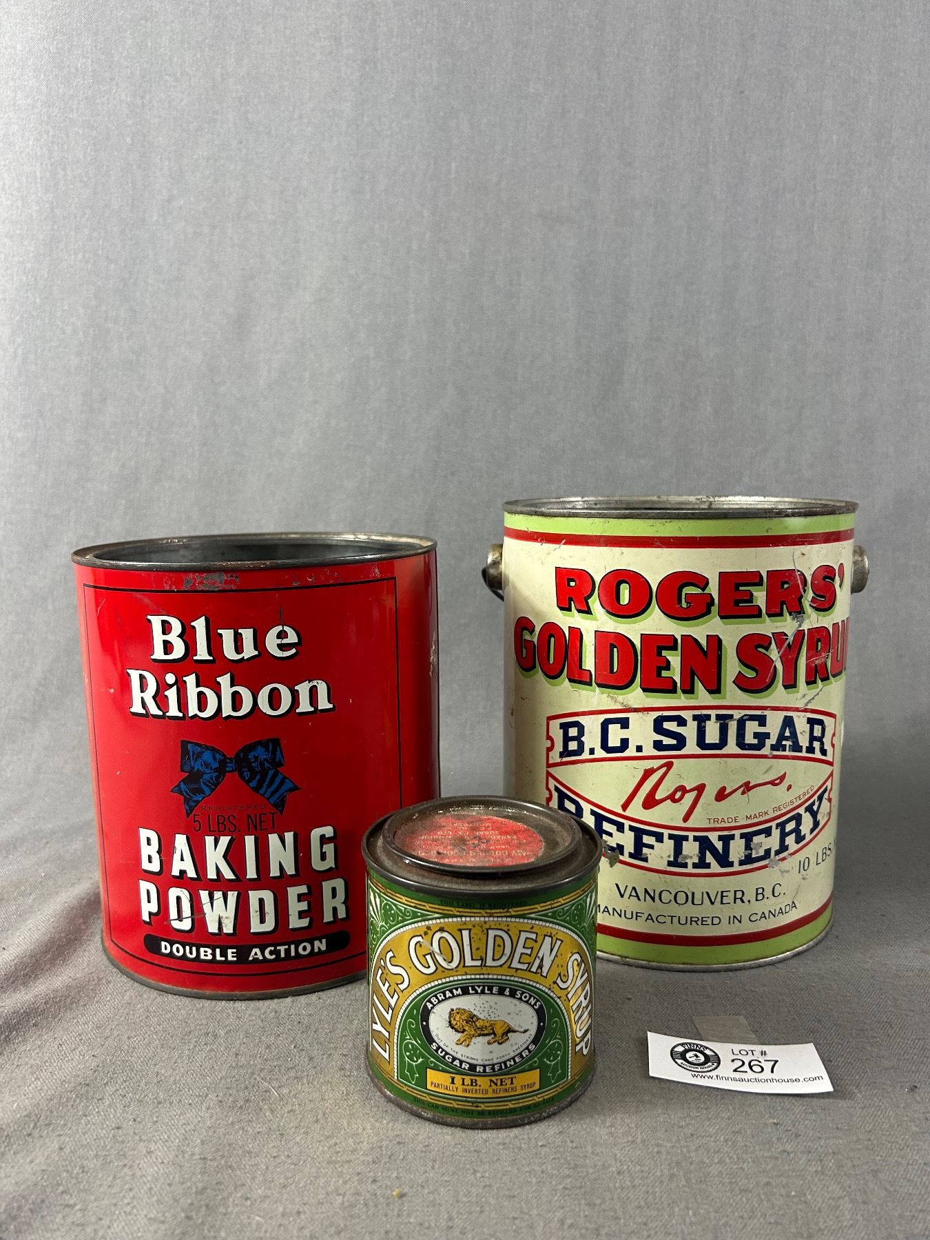 3 Old Kitchen Tins - Large Blue Ribbon Baking Powder, Rogers Syrup (No Lids) & Small Lyle's Golden Syrup Tin w/Lid