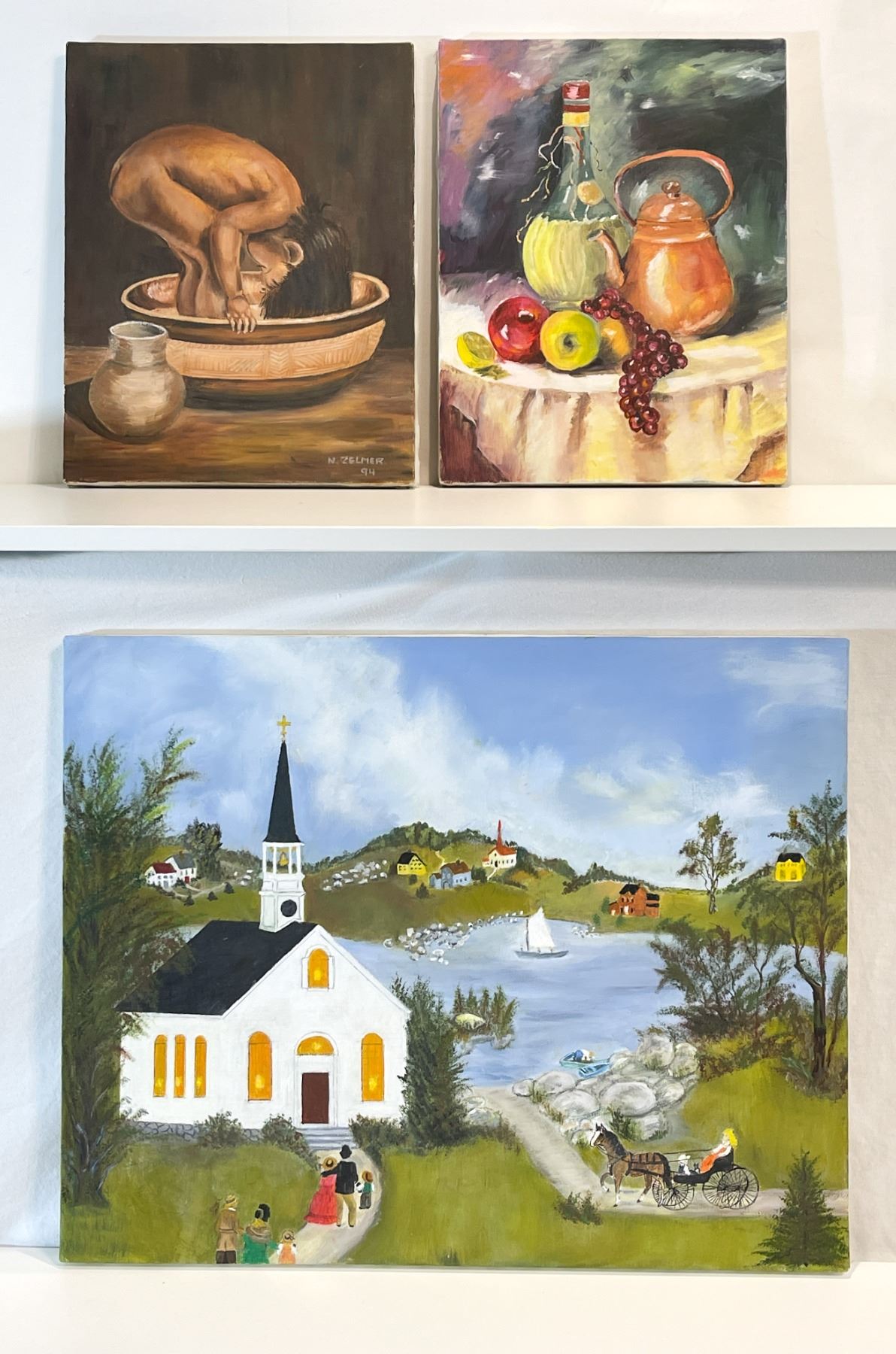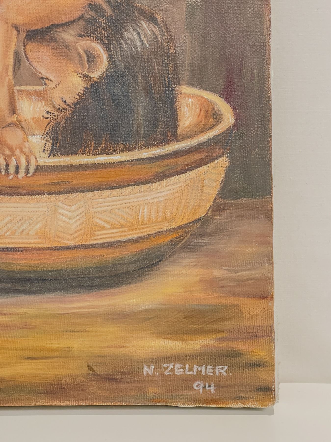 One is signed N.Zelmer, the other two are unsigned. One stilllife, one primitive style reminiscent of Grandma Moses, and the other depicts a young child being bathed in large vessel.