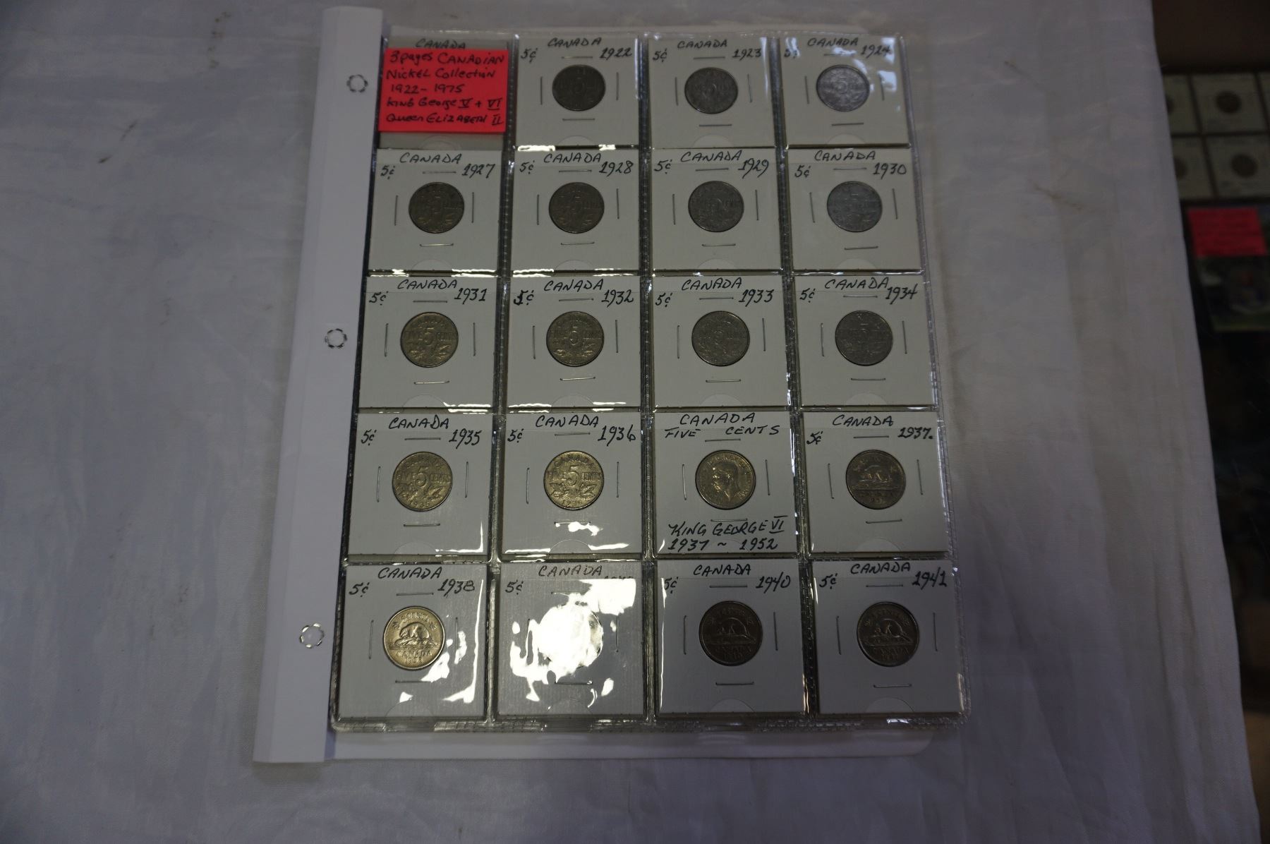 3 PAGES OF CANADIAN NICKELS 1922-1975 IN FOLDER KING GEORGE V AND 6, QUEEN ELIZABETH II 59 COINS