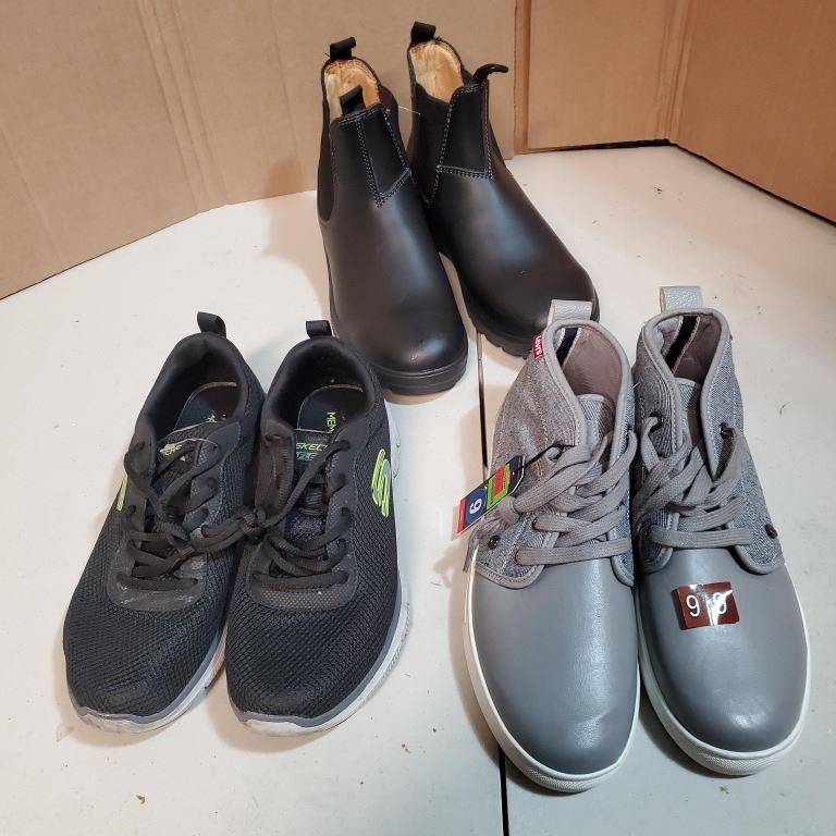3 PAIRS OF AS NEW SIZE 9 FOOTWEAR INCLUDING LEVI'S, SKETCHERS AND PROSPECTOR