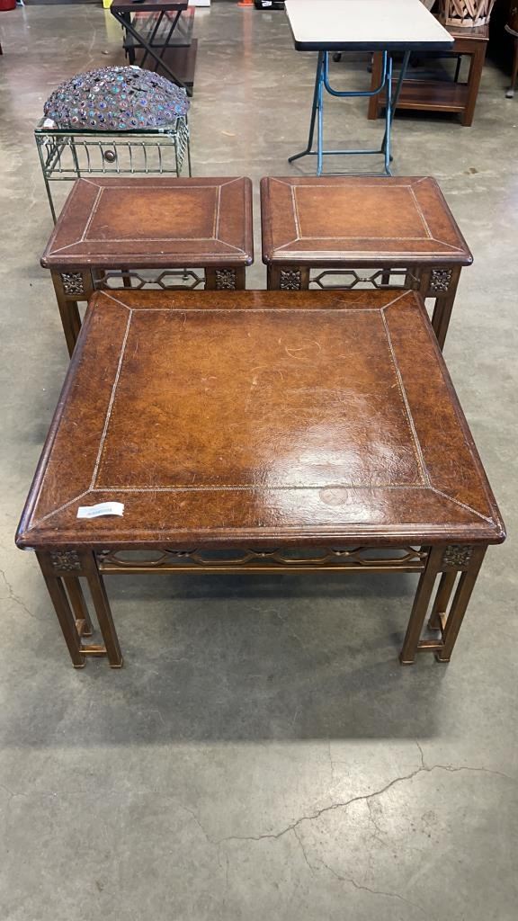 3 PC LEATHER TOP COFFEE AND END TABLE SET