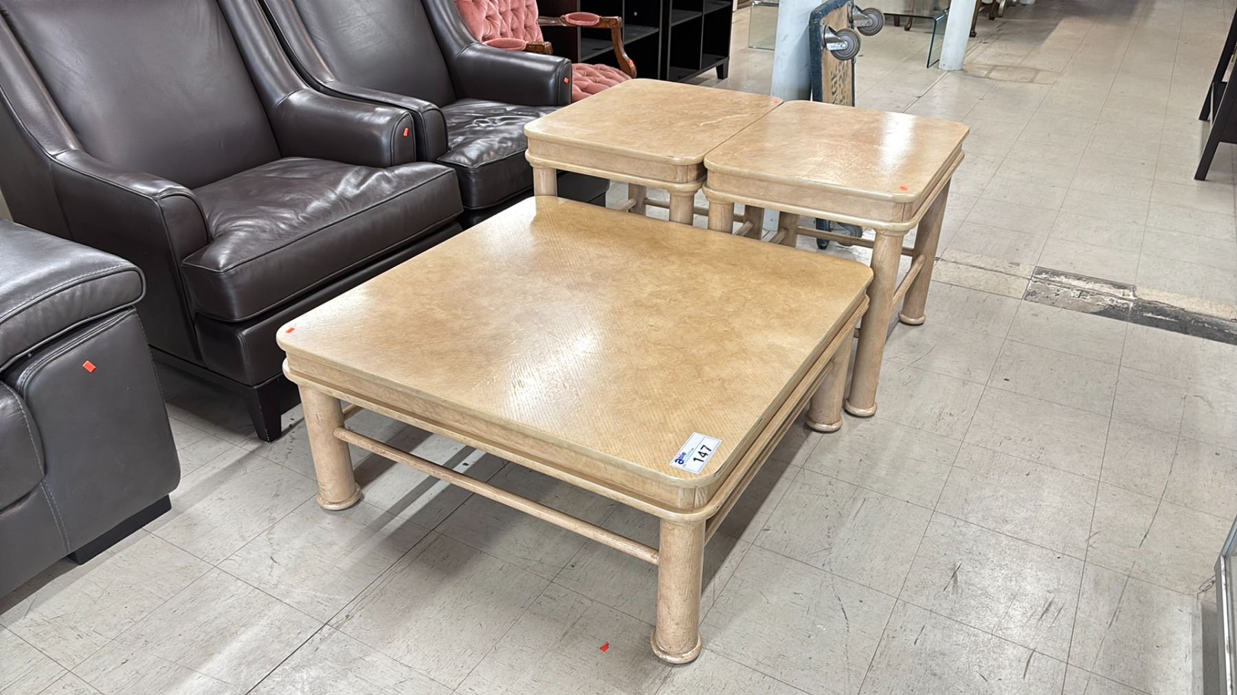 3 PIECE TABLE SET: SQUARE COFFEE TABLE - 38"W X 38"D X 17"H & 2 SIDE TABLES - 27"W X 21"D X 24"H