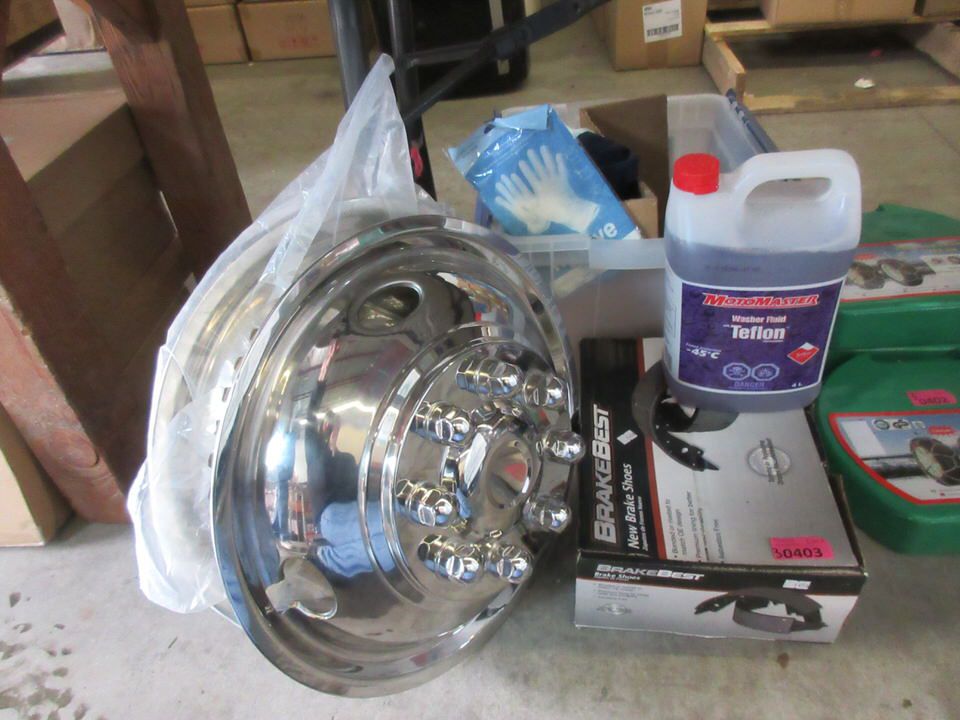 Brake shoes, hubcaps and tote of windshield washer and other fluids.