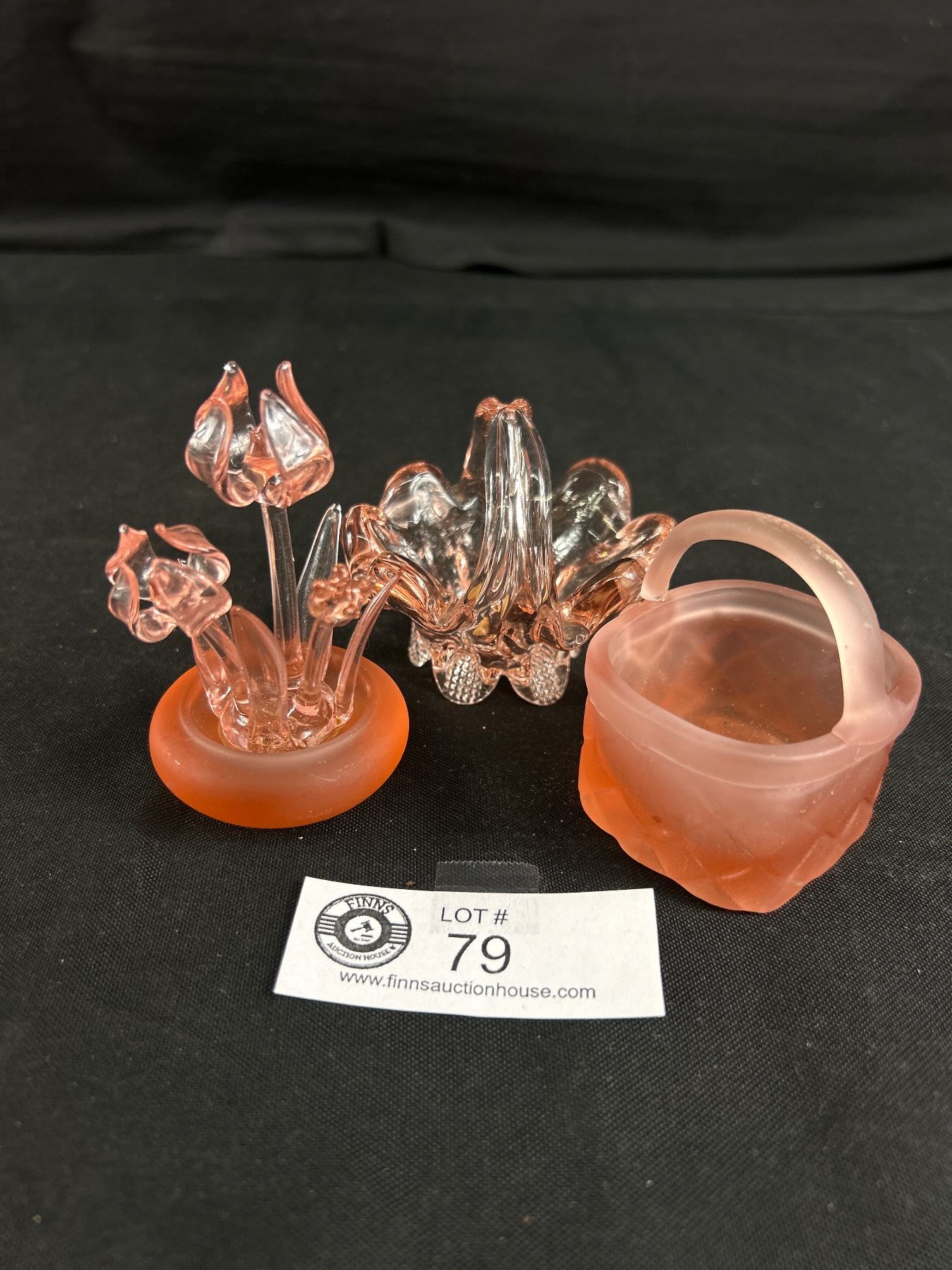 3 Pcs. Vintage Glass Art- 3" Tulips, 2.5" Frosted Basket & 3" Murano Basket