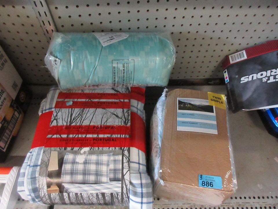 50" x 60" throw blanket, set of twin flannel sheets, and full size flannel sheet set. Customer returns.