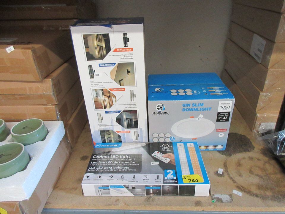 Modern wall sconce, cabinet LED light & set of 6 x 6" slim downlights.