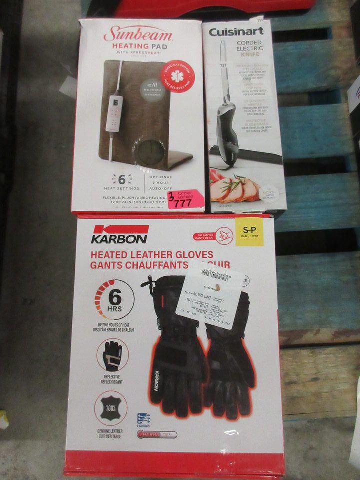 Karbon Leather Heated Gloves, Cuisinart Electric Knife & Sunbeam Heating Pad. Customer returns.