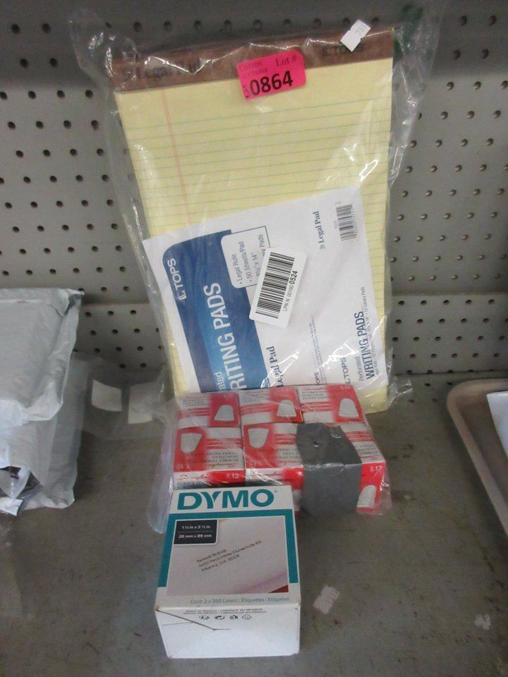 Package of 12 legal size lined pads, box of Dymo labels and bag of 6 boxes of 12 small rubber finger tips.