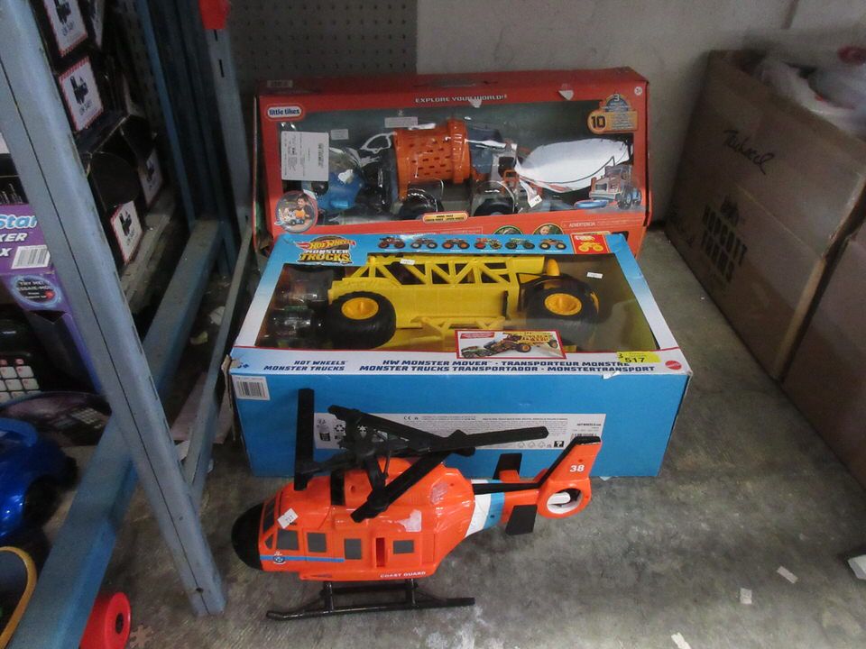 Coast Guard helicopter, Hot Wheels Monster Mover, and a Little Tikes Rock Tumbler truck set.