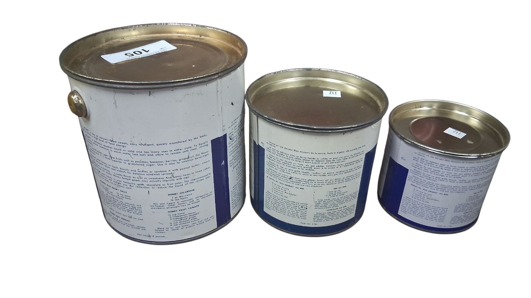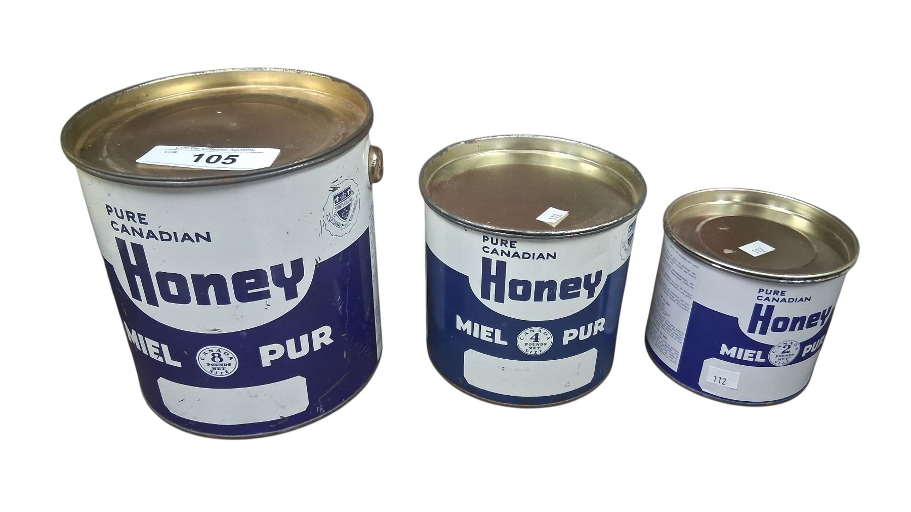 3 Pure Canadian Honey vintage cans, 2, 4, 8 lbs