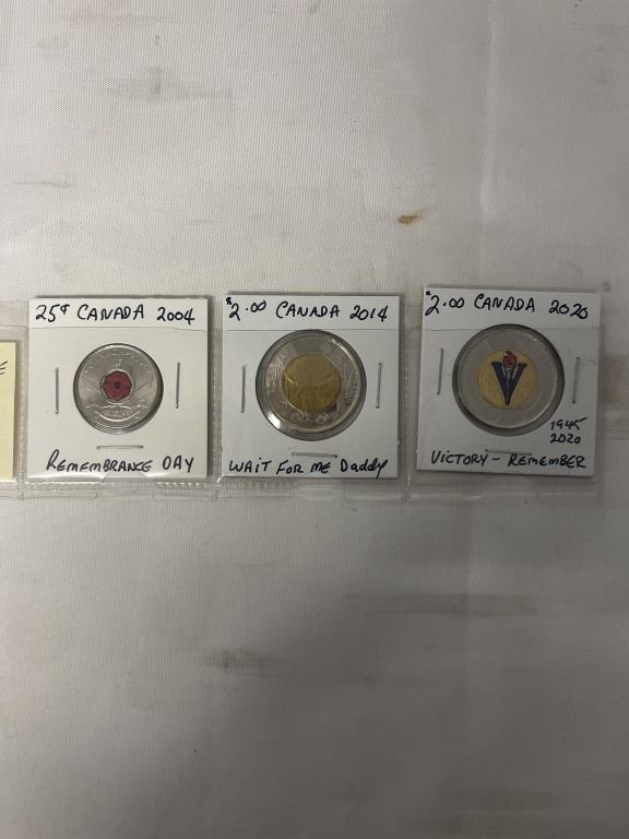 3 REMEMBRANCE DAY COINS - 2004 25 CENT, 2014 $2 WAIT FOR ME DADDY, 2020 VICTORY $2
