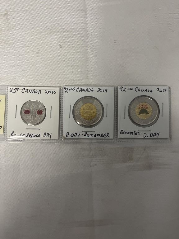 3 REMEMBRANCE DAY COINS - 2010 POPPY 25 CENT AND BOTH TYPES 2019 D-DAY $2