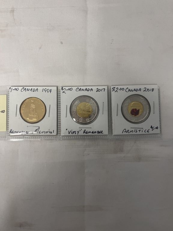 3 REMEMBRANCE DAY COINS MINT 1994 MEMORIAL $1, 2017 VIMY $2, 2018 ARMSTICE $2