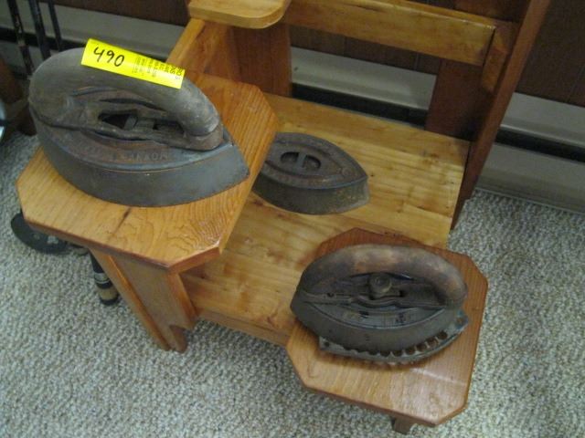 3 SAD IRONS, 2 HANDLES & A HOT PLATE TRIVET