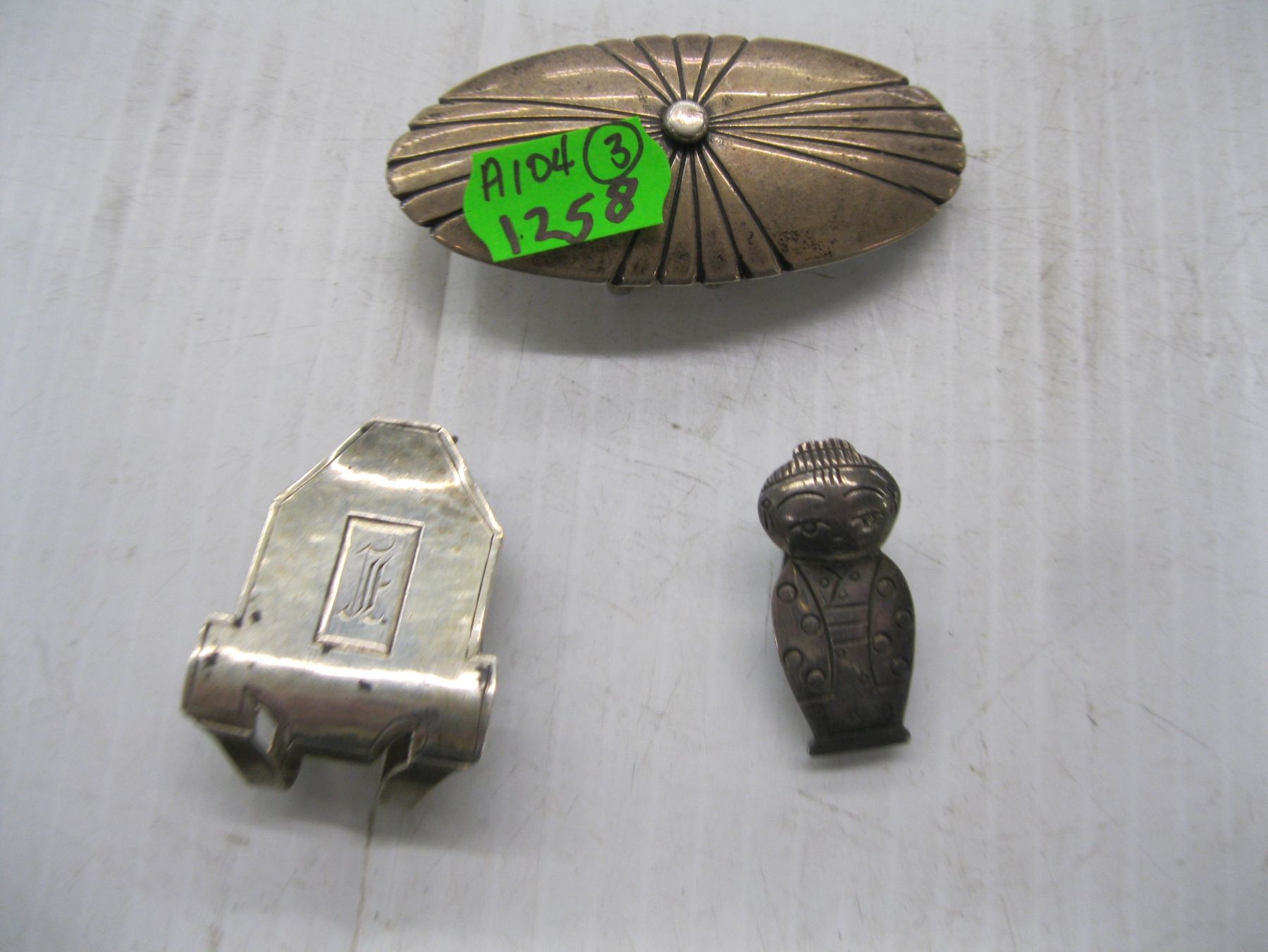 3 SILVER PIECES - PIN, BELT BUCKLE & CLIP