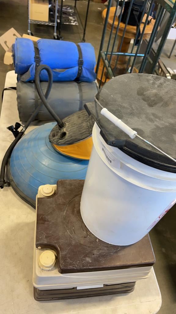 3 SLEEPING PADS WITH 2 PORTABLE LOOS, BALANCE EXCERSIZER AND FOOT PUMP