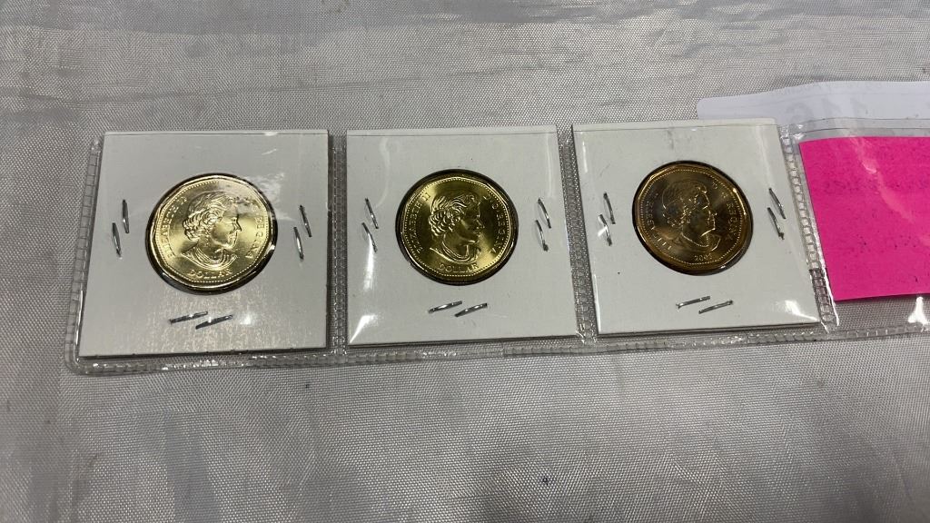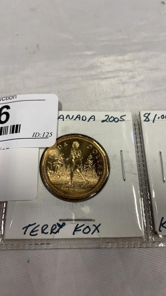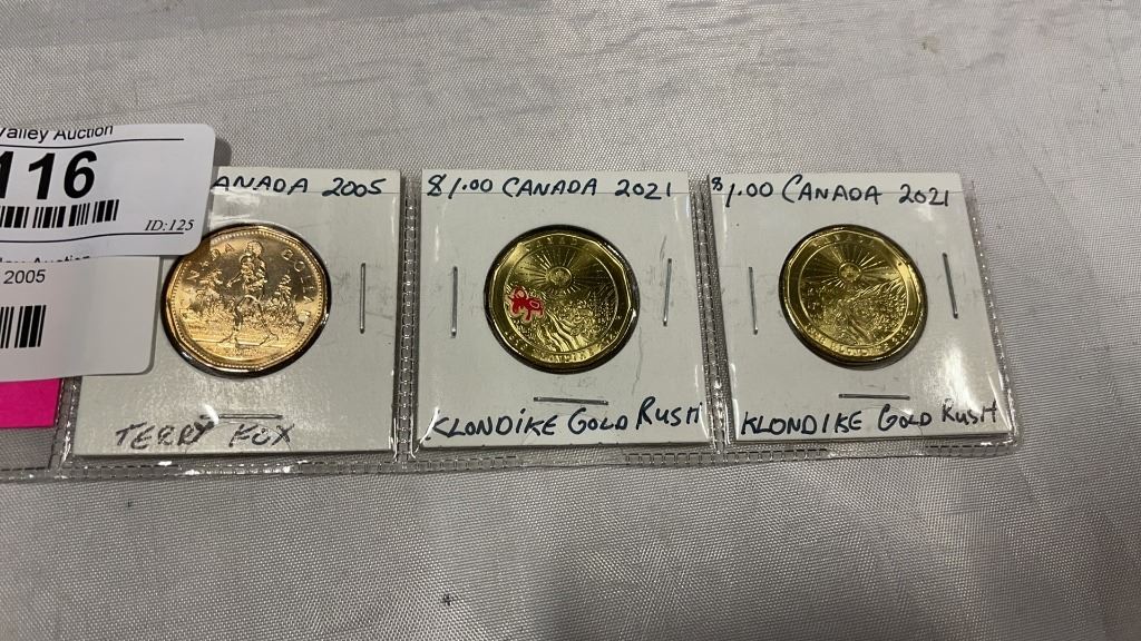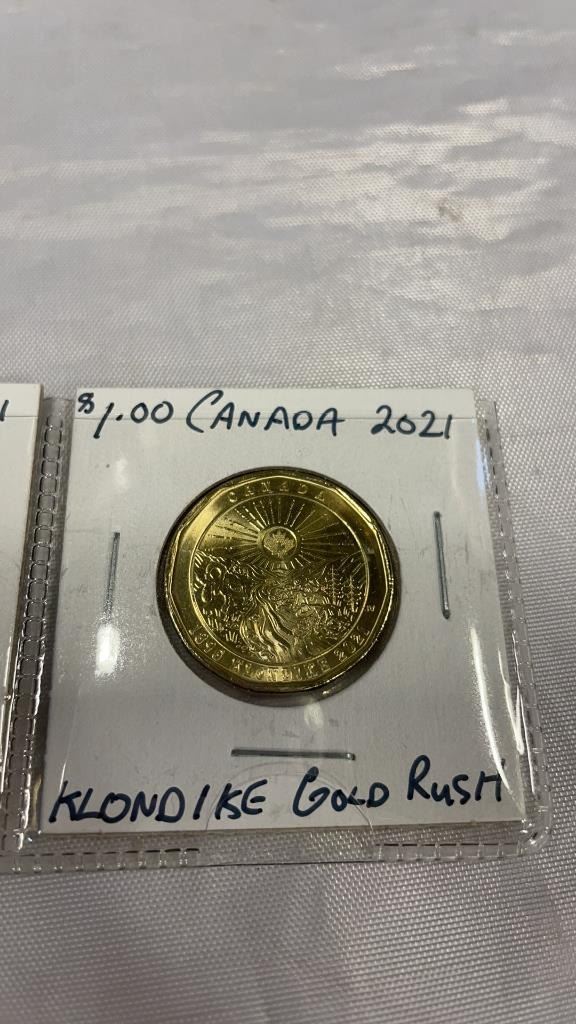 3 SPECIAL CANADIAN LOONIES - 2005 TERRY FOX, 2021 KLONDIKE GOLD RUSH, BOTH TYPES COLOURED AND UNCOLOURED
