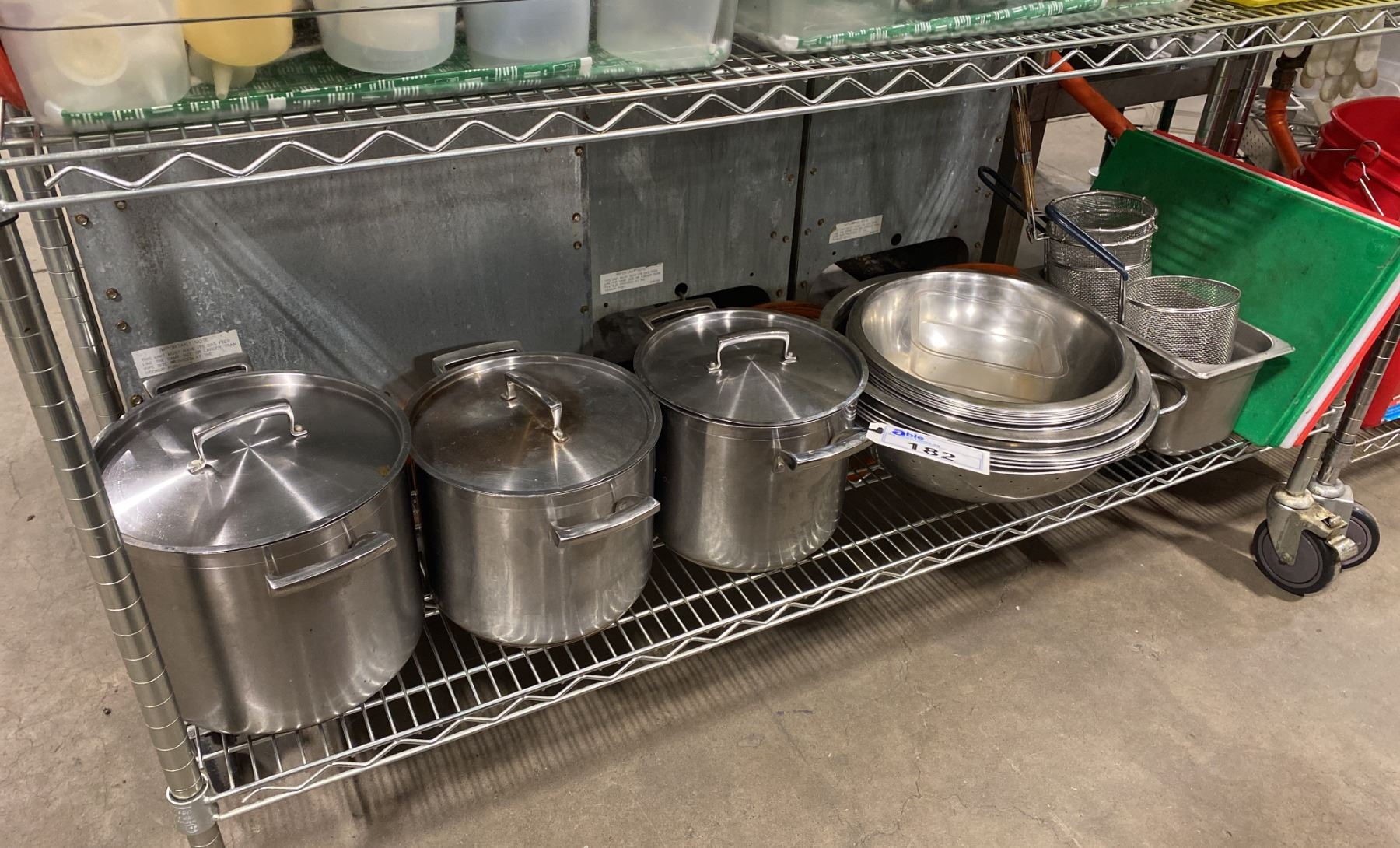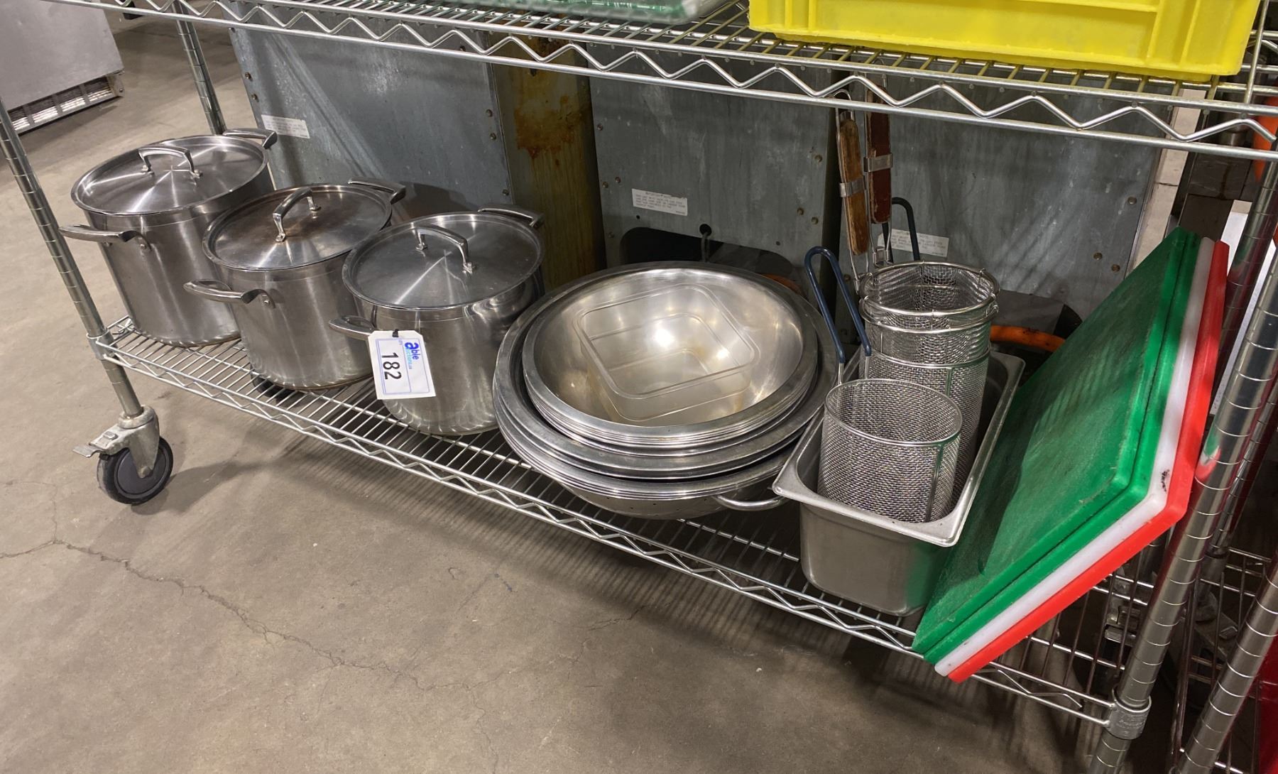 3 STAINLESS STEEL COMMERCIAL STOCK POTS WITH LIDS, ASSORTED STAINLESS STEEL MIXING BOWLS, DEEP FRY BASKETS & COMMERCIAL CUTTING BOARDS