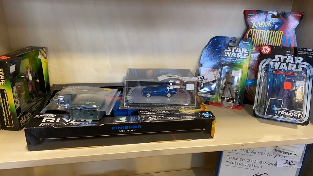 3 STARWARS ACTION FIGURES, RIVAL NERF GUN, XMEN ACTION FIGURE AND TOY CAR