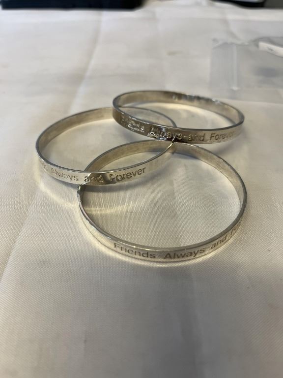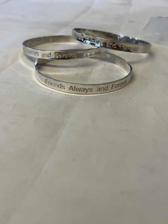 3 STERLING SILVER BANGLES, SAME SIZES, "FRIENDS" "ALWAYS" AND "FOREVER"