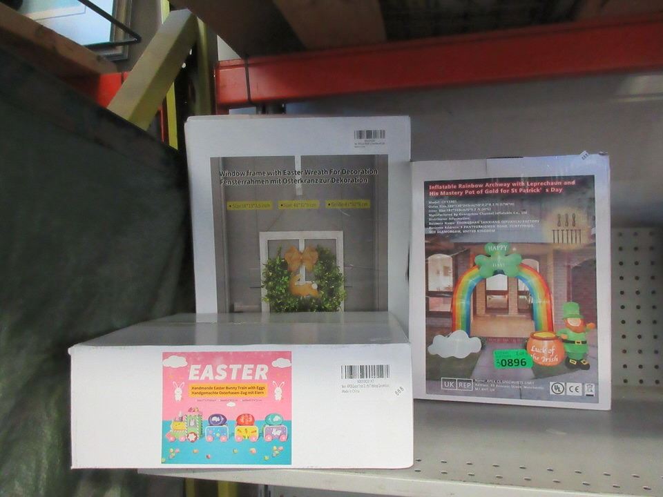 Inflatable Leprechaun Arch, Easter Egg Train, and Christmas Window Framed Wreath.