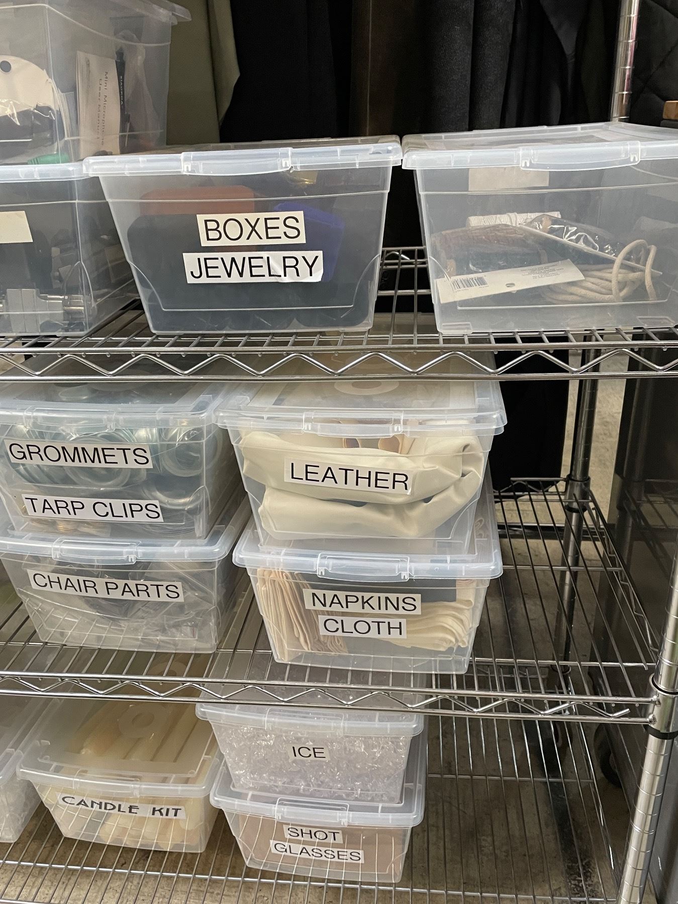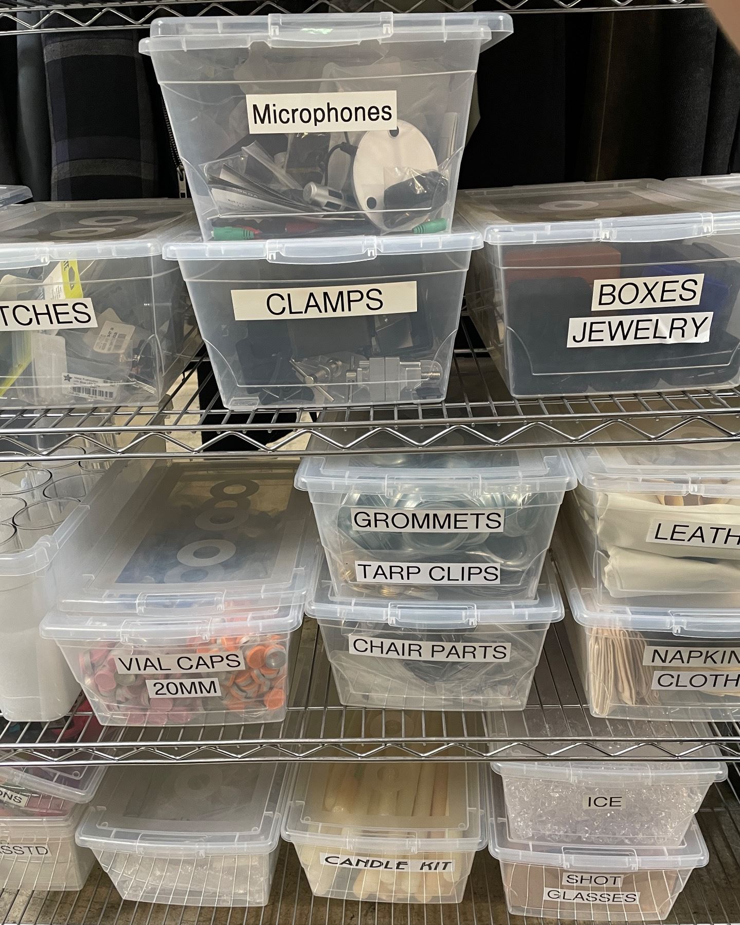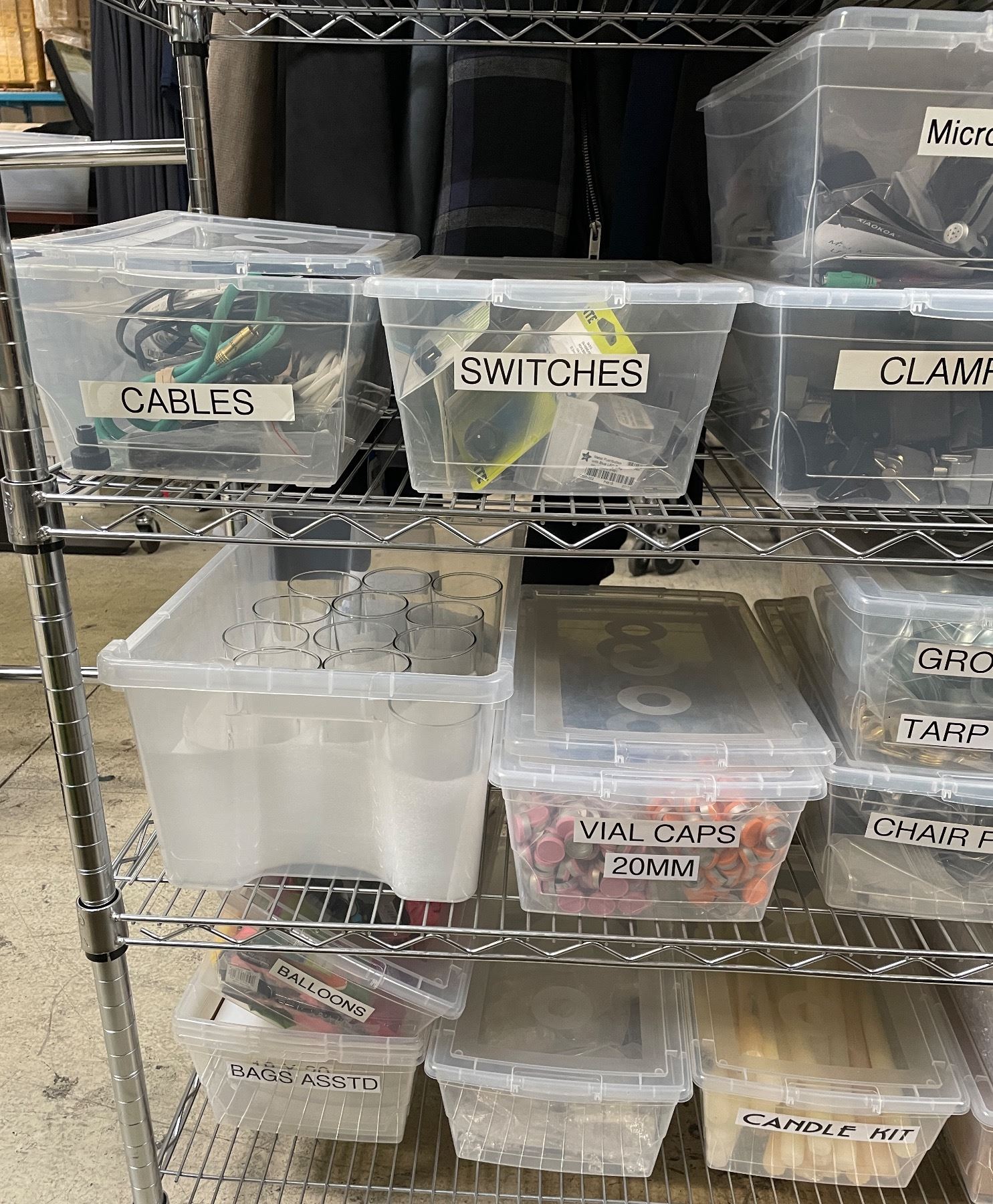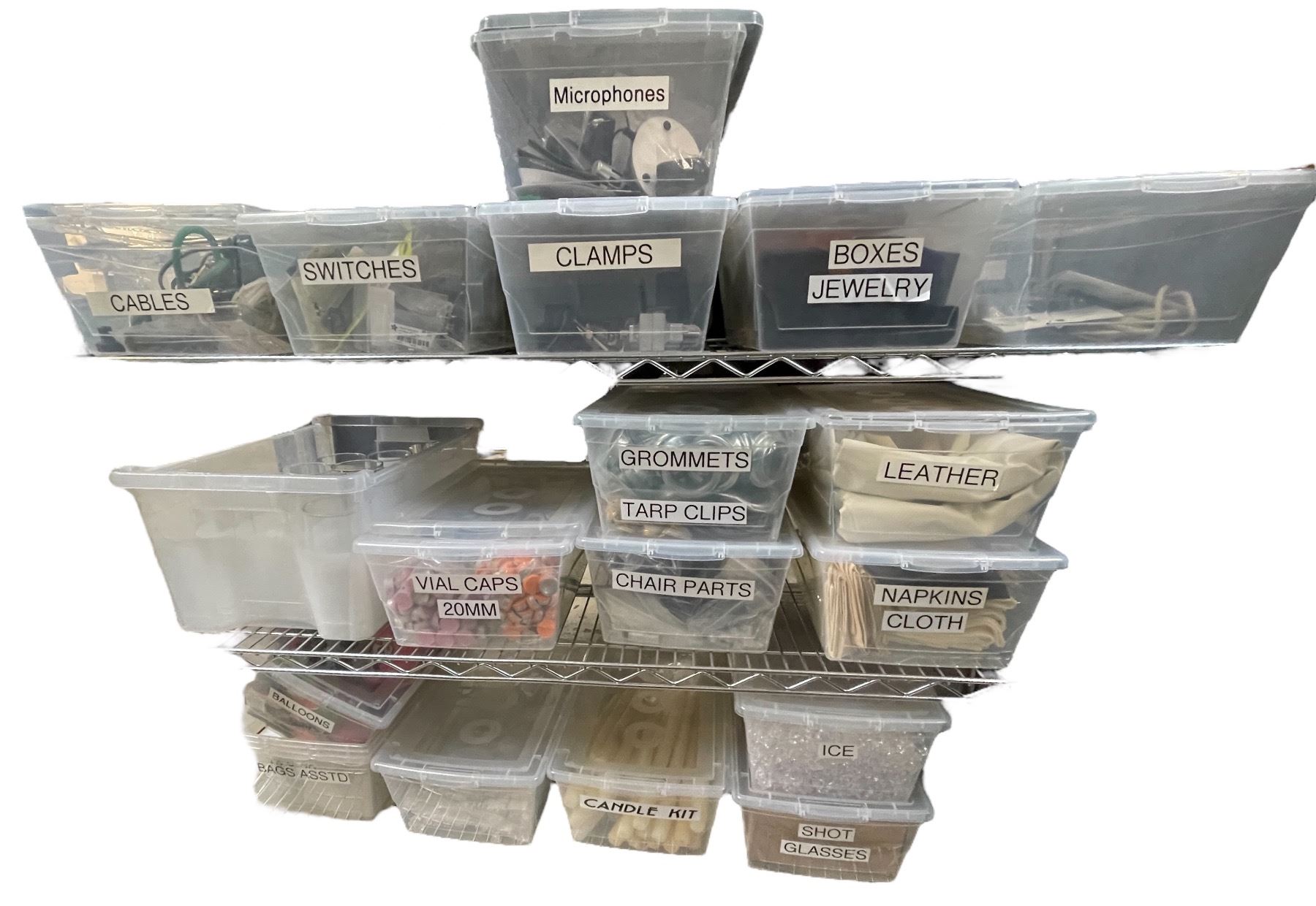 3 Shelfs of Movie Set Misc - Tape Vinyl, Doorbells, Euro Chargers, Clamps, Switches, Chair Parts, Jewelry Boxes Cables, Etc.