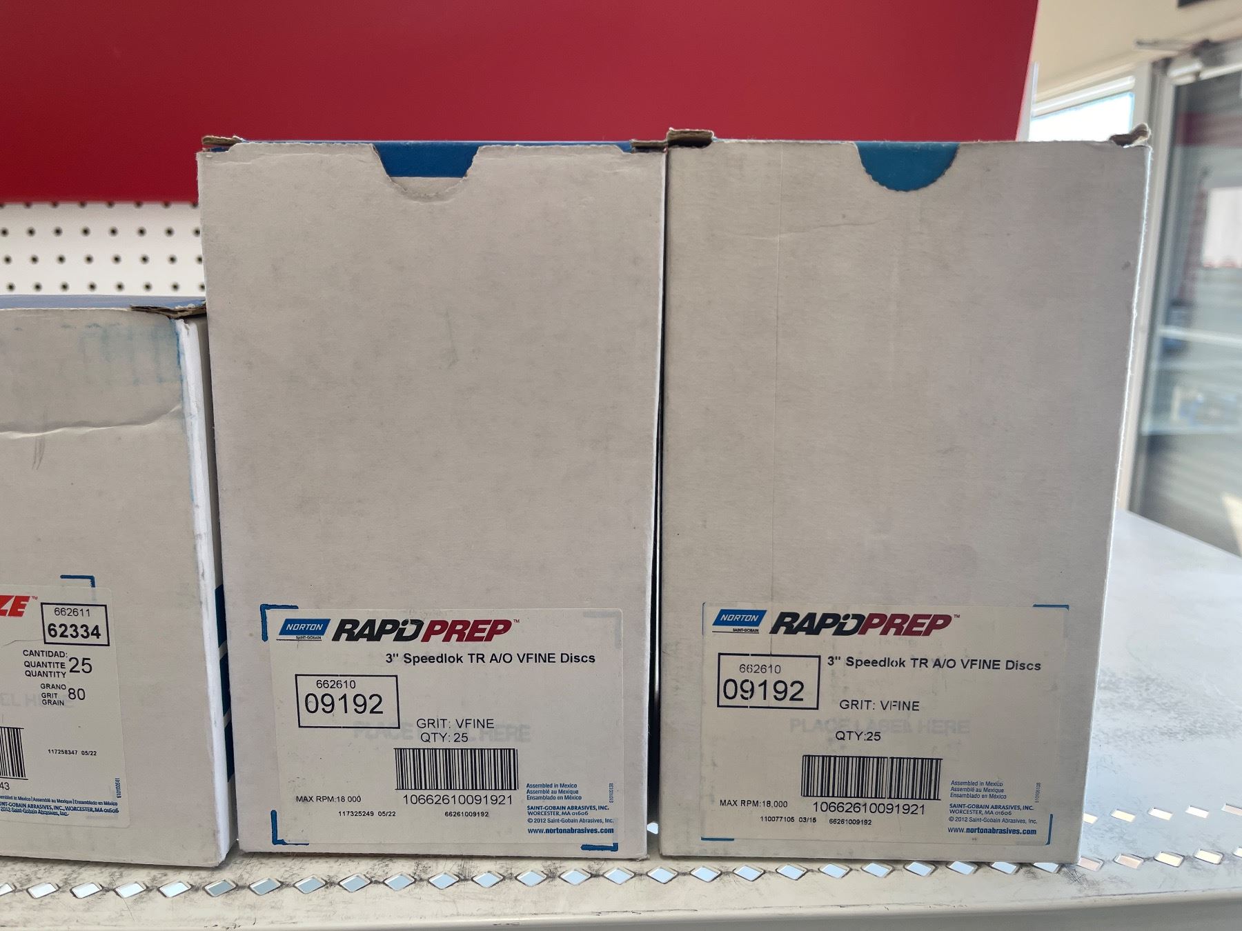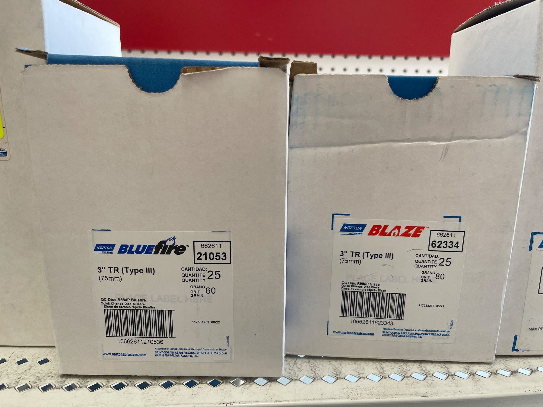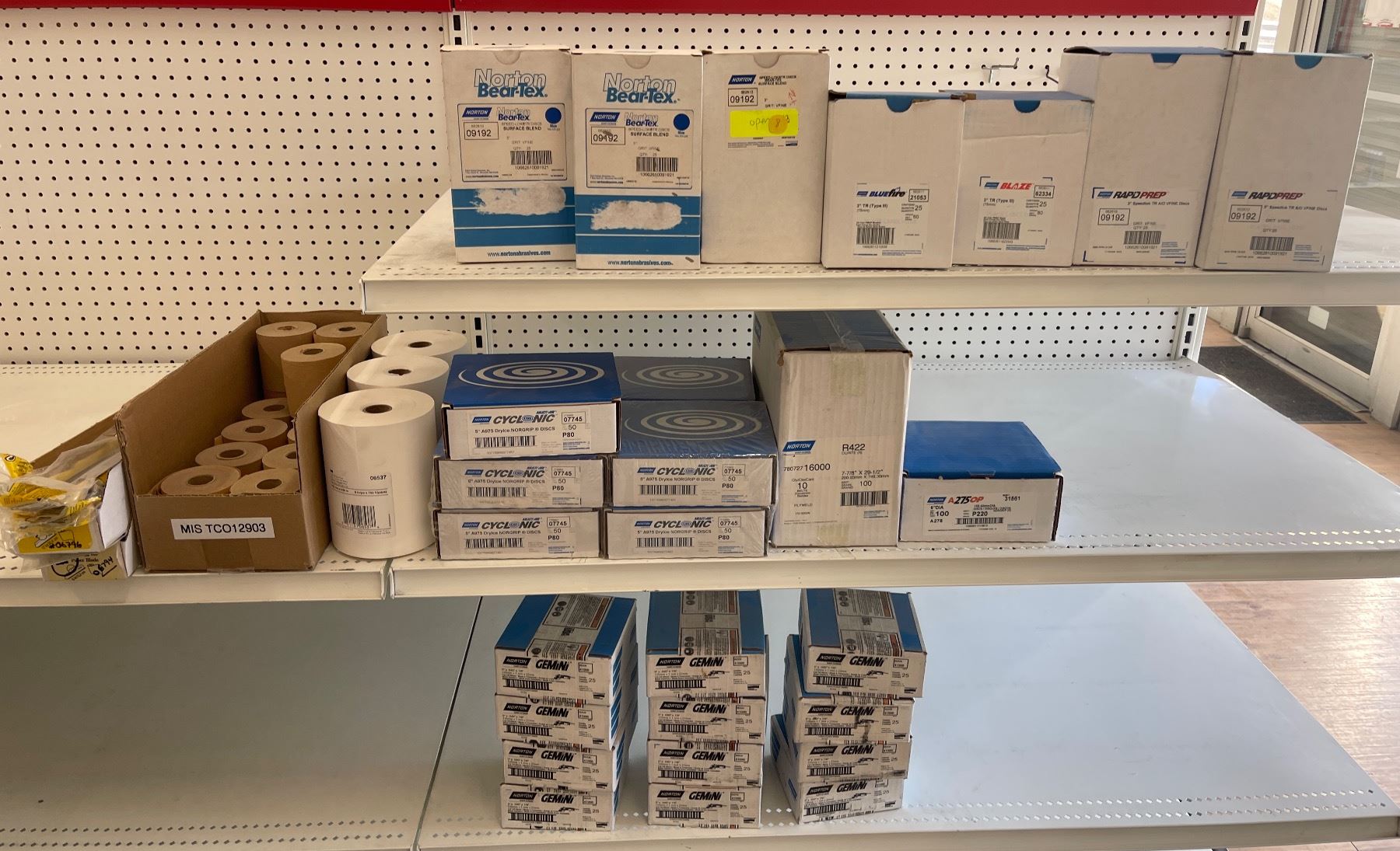 3 Shelves of Misc Norton Products - 5" DryIce NorGrip Discs, Cut-Off Wheel, 3" TR (Type III) 6" Dics, 3" Speed Lok Discs, White Making Paper, Etc.