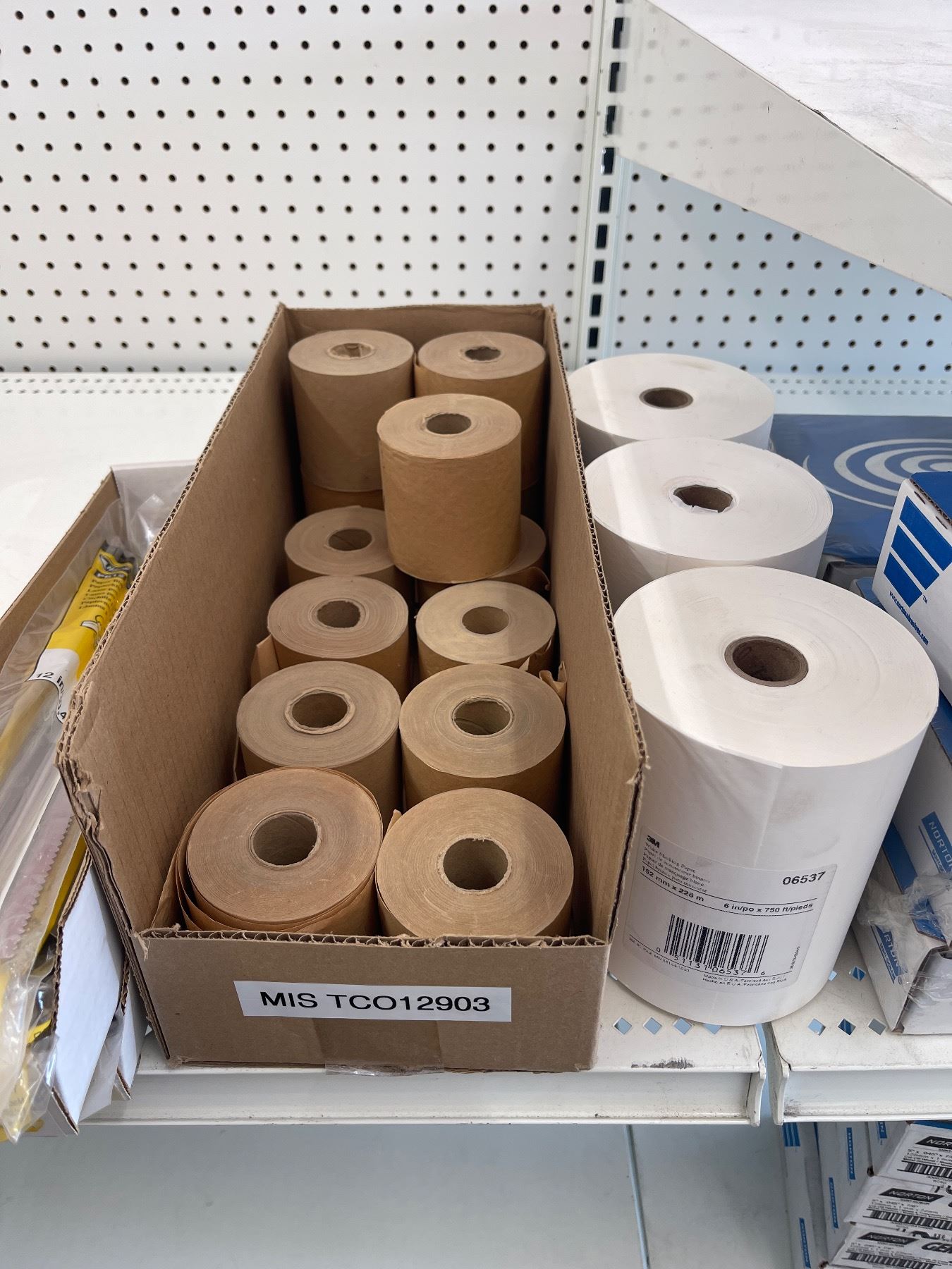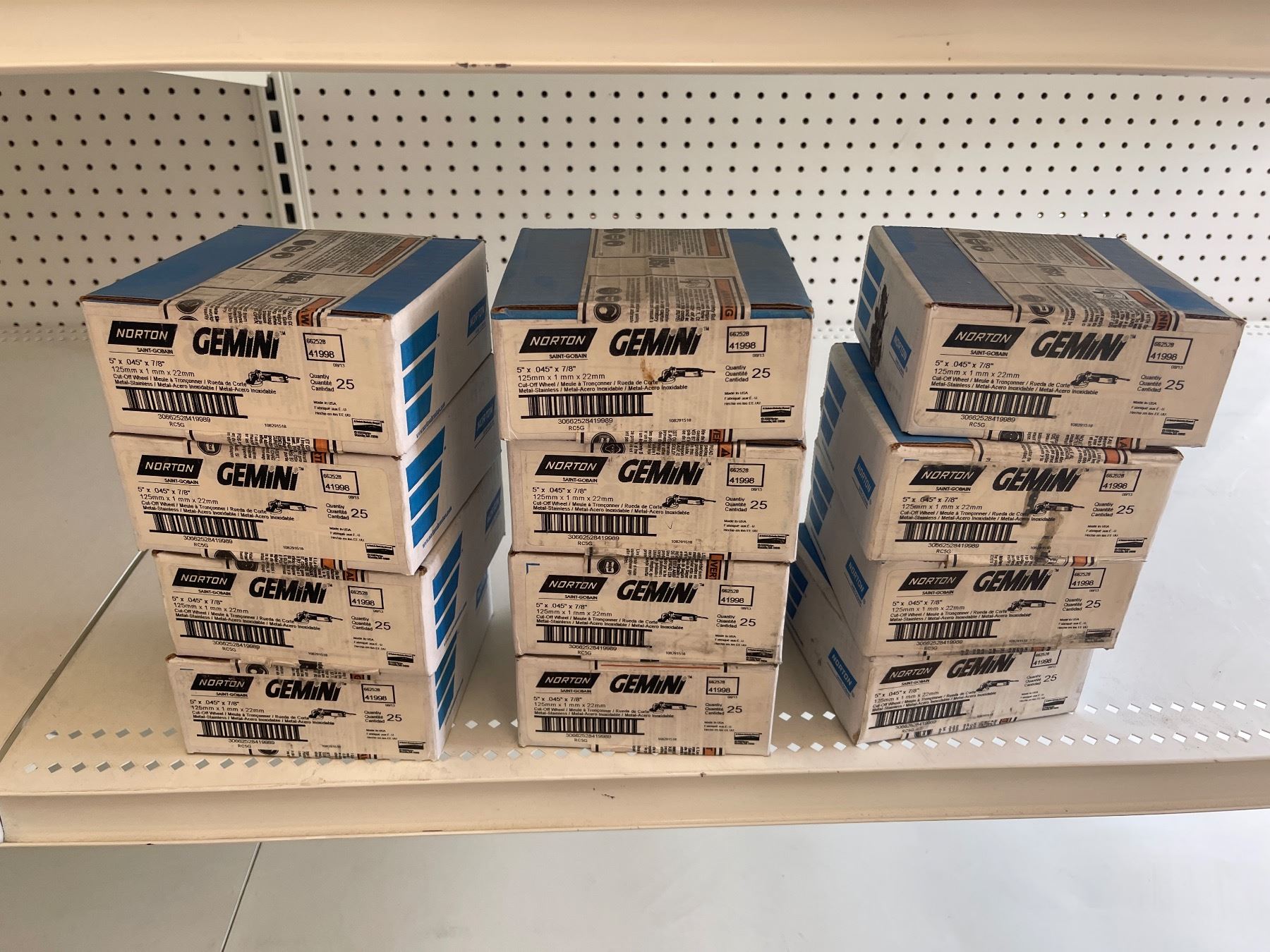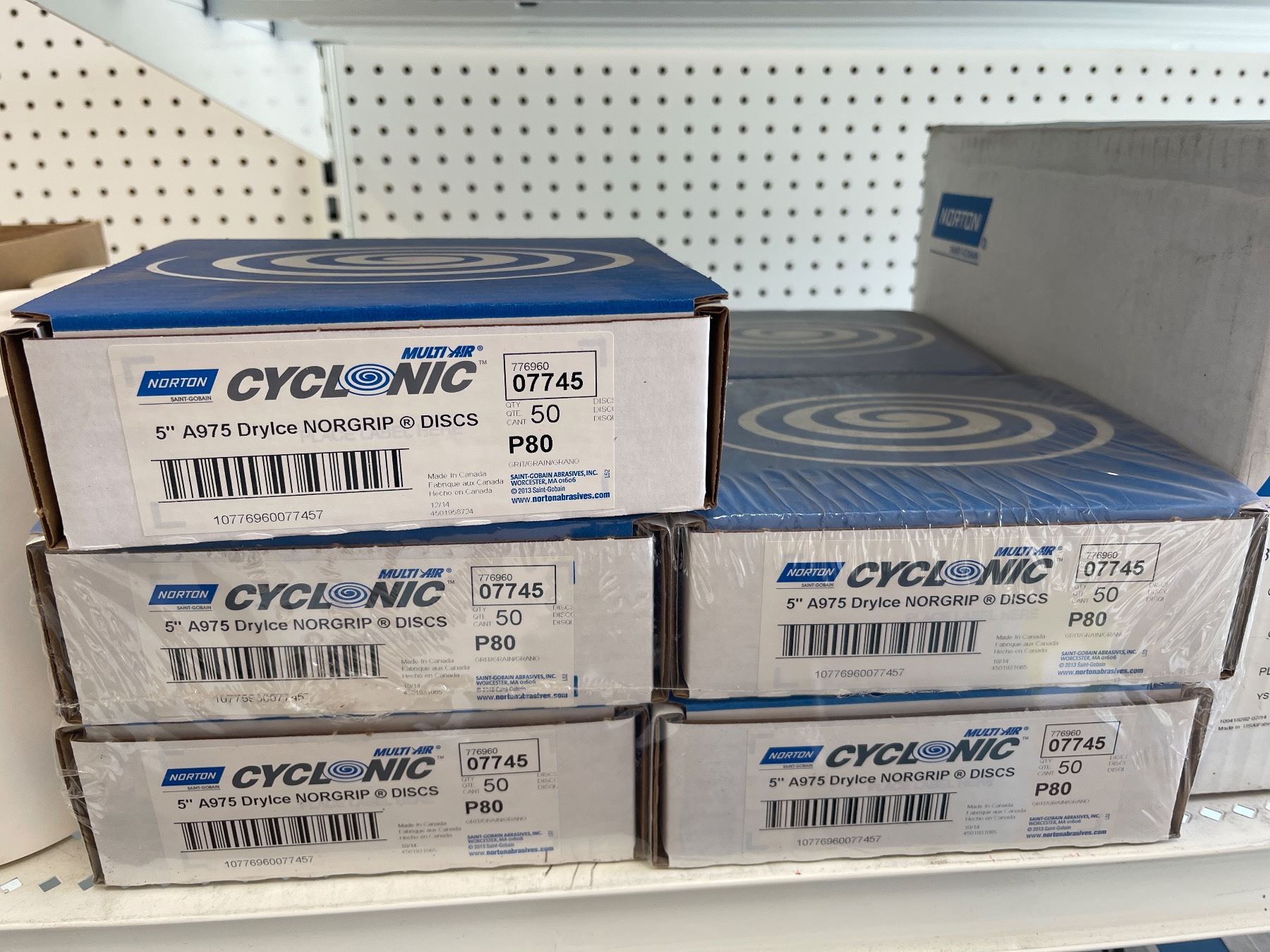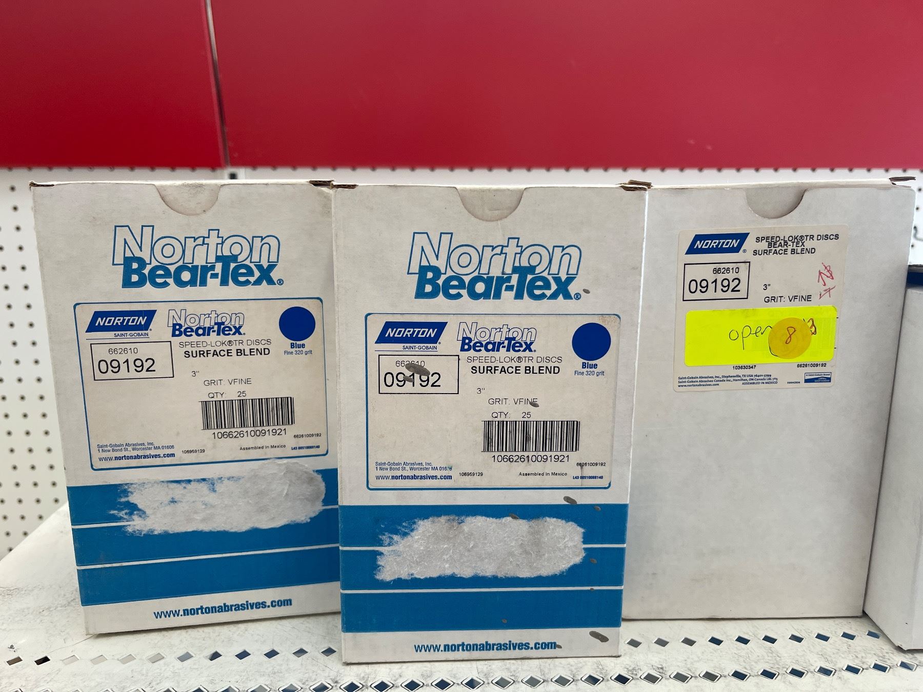 3 Shelves of Misc Norton Products - 5" DryIce NorGrip Discs, Cut-Off Wheel, 3" TR (Type III) 6" Dics, 3" Speed Lok Discs, White Making Paper, Etc.