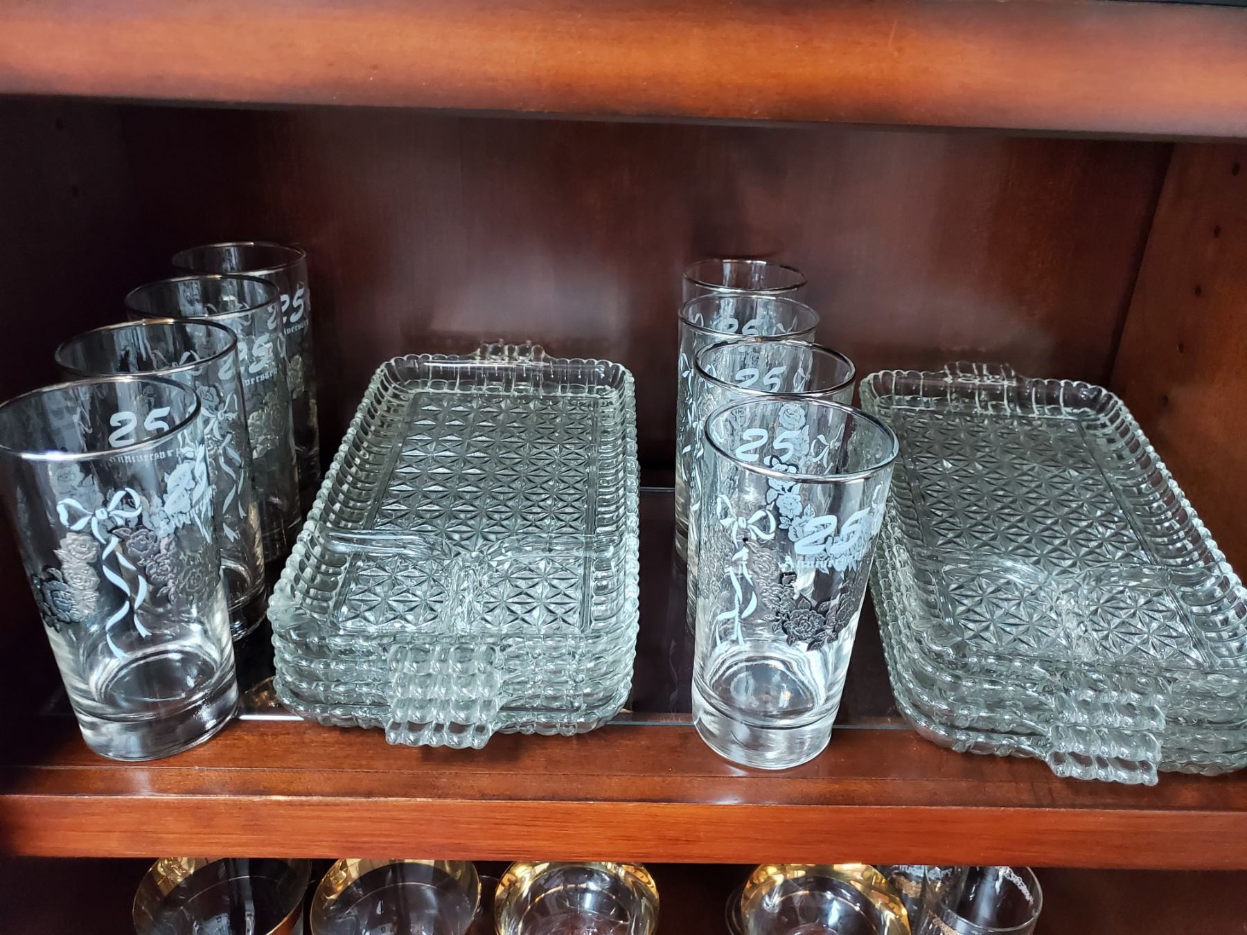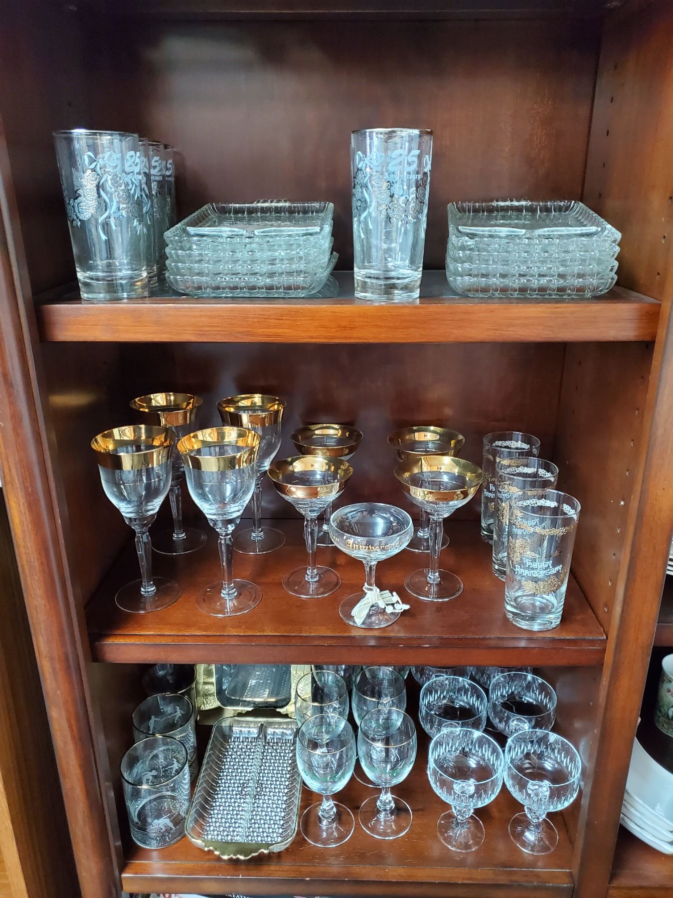 3 Shelves of Silver & Gold Anniverary glass ware - Most Items have not been tested - 17% Buyer Fee. Payment Processed through Live Auction World ( Visa or Master Card ) pick up Saturday, or Tuesday