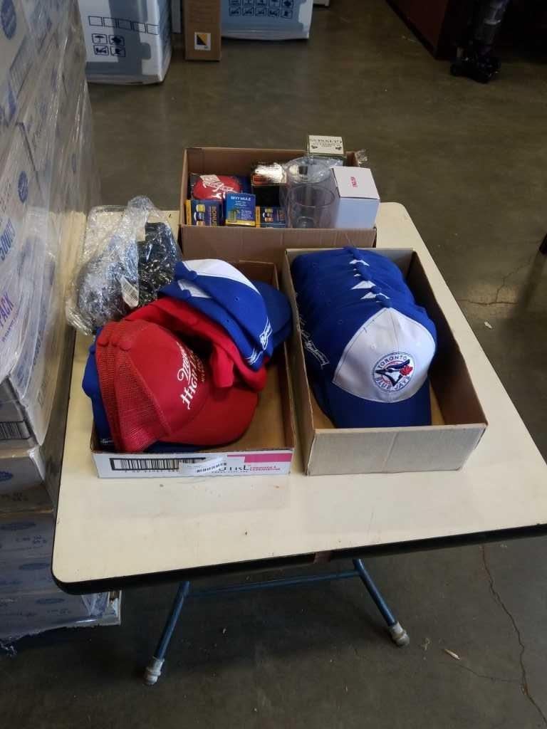 3 TRAYS OF HATS, BEER GLASSES, WIRELESS MINI SPEAKERS