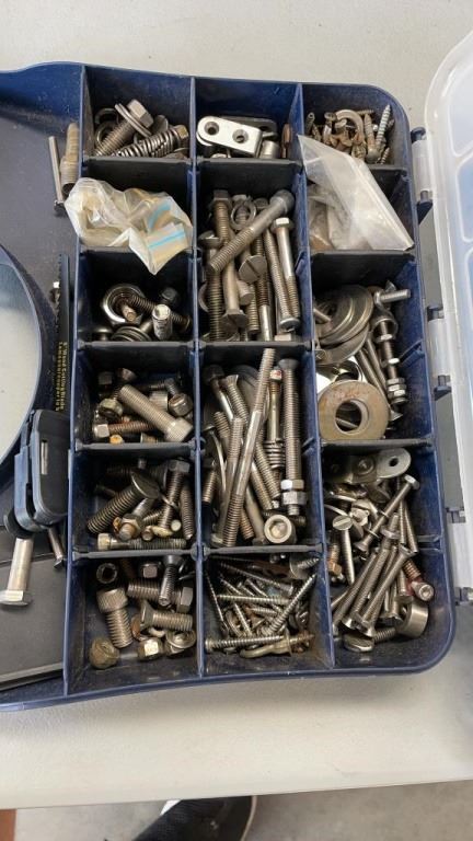 3 TRAYS OF MACHINING PARTS, DRILL BITS, BOLTS, STAINLESS HARDWARE