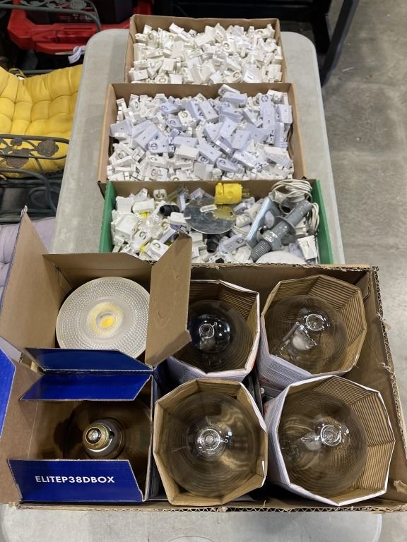 3 TRAYS OF NEW ELECTRICAL BULB CONNECTORS, METAL HALLIDE BULBS ETC