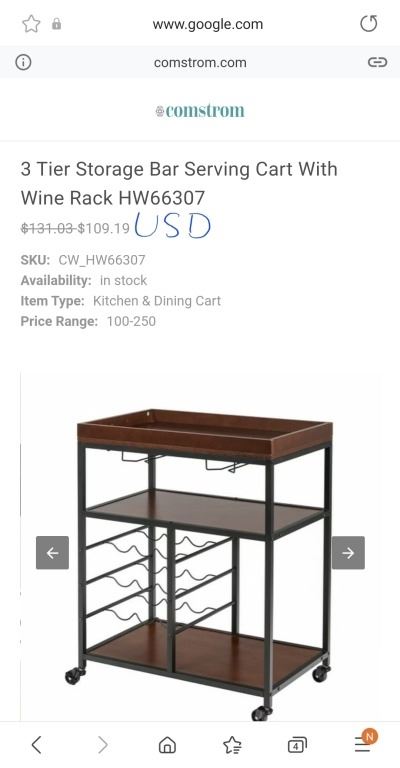 3 Tier Storage Bar Serving Cart With Wine Rack HW66307