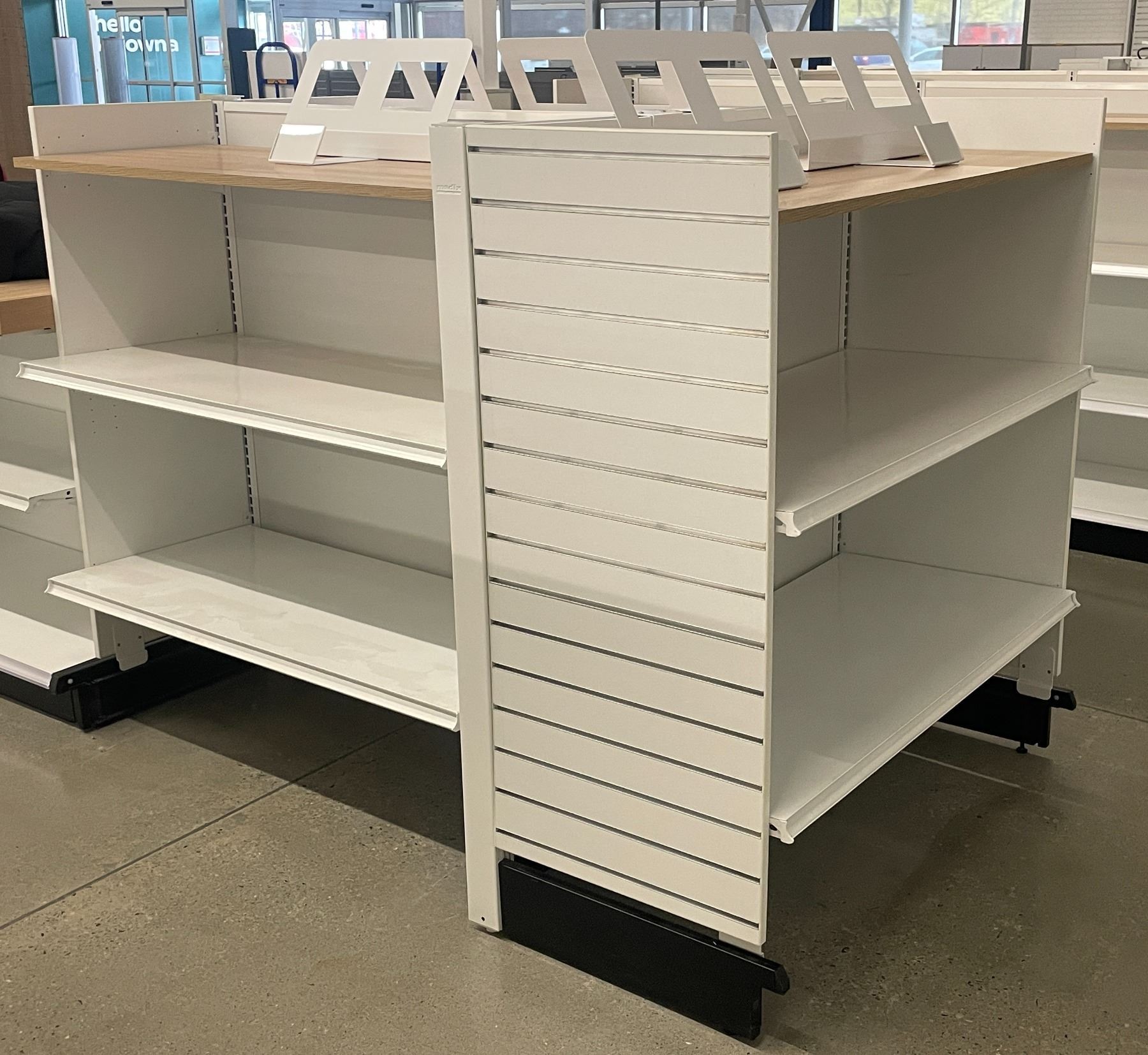 3 Tier retail double-sided gondola with single end cap w/4 display stands (approx. 73in W 55in H 50in D - excellent condition, Madix brand) BIDDERS ARE RESPONSIBLE FOR ALL COSTS ASSOCIATED WITH PICKUP OF THEIR LOTS INCLUDING BUT NOT LIMITED TO RENTAL OF EQUIPMENT, FORKLIFTS, LABOUR, TRUCKING, TOOLS ETC.